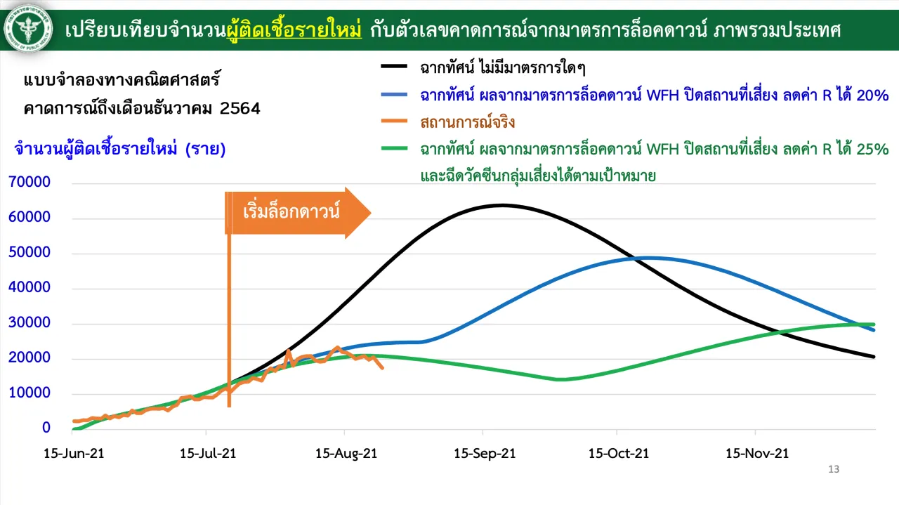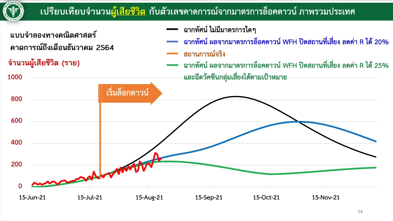 สำหรับตัวเลขคาดการณ์จากมาตรการล็อกดาวน์ ล่าสุดผู้ติดเชื้อสถานการณ์จริงต่ำกว่าที่คาดการณ์ และต้องขอบคุณความร่วมมือพี่น้องประชาชน ขณะที่คาดการณ์ผู้เสียชีวิต สถานการณ์จริงยังสูงอยู่ ซึ่งการล็อกดาวน์ Work From Home ปิดสถานที่เสี่ยง การเข้ารับการฉีดวัคซีนโควิด ต้องเร่งดำเนินการอย่างต่อเนื่อง