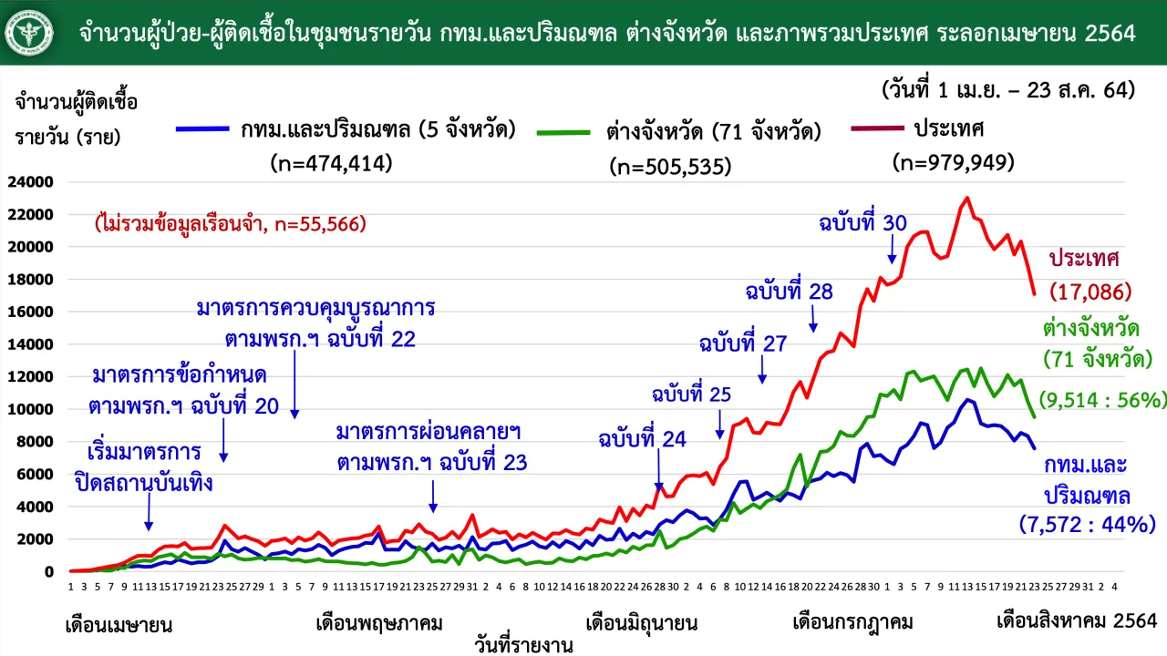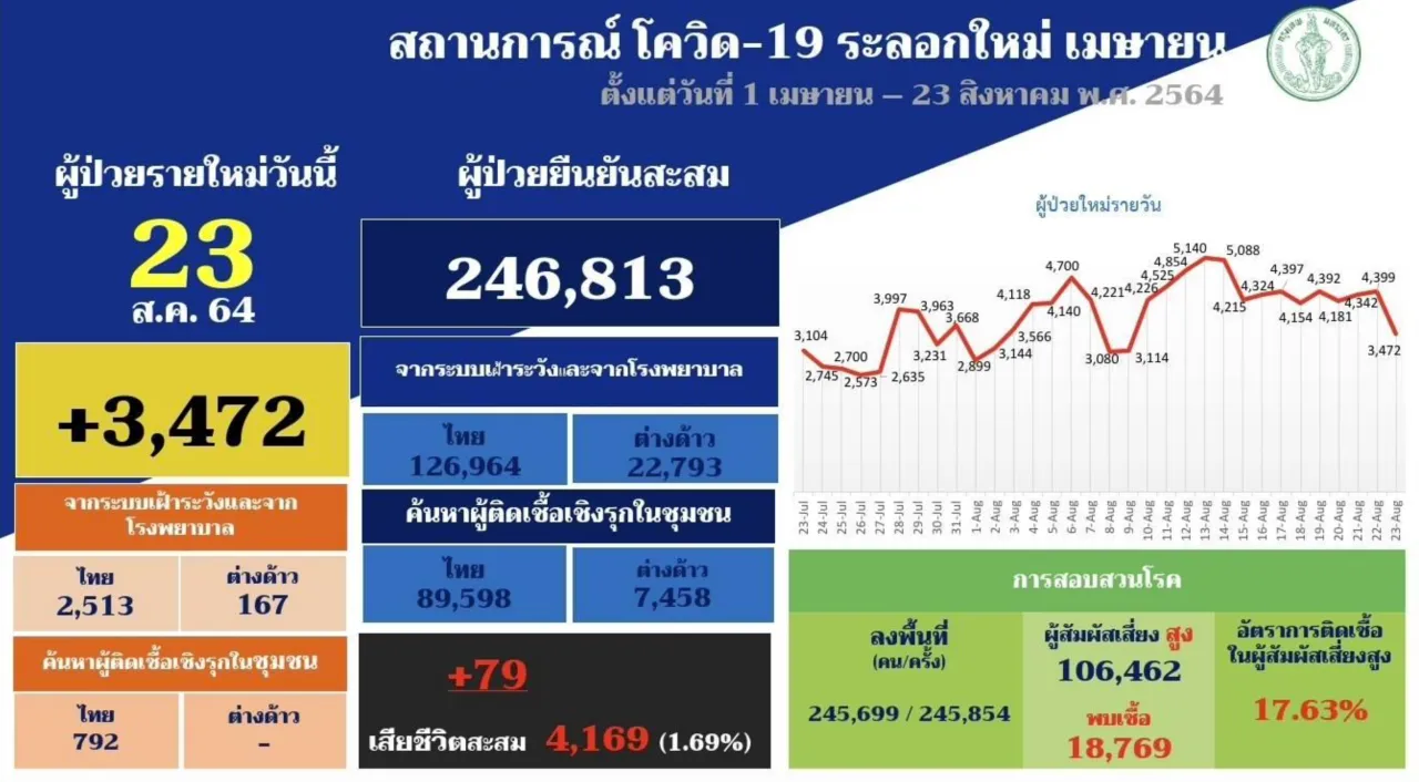 วันที่ 23 ส.ค. 2564 นายแพทย์ทวีศิลป์ วิษณุโยธิน โฆษกศูนย์บริหารสถานการณ์การแพร่ระบาดของโรคติดเชื้อไวรัสโคโรนา 2019 (โควิด-19) หรือ ศบค. แถลงข่าวที่ทำเนียบรัฐบาล โดยช่วงหนึ่งกล่าวถึงการระบาดและติดเชื้อโควิด-19 ในพื้นที่กรุงเทพมหานคร ว่า กทม. มีรายงานติดเชื้อ 3,472 รายใหม่ เสียชีวิต 79 ราย