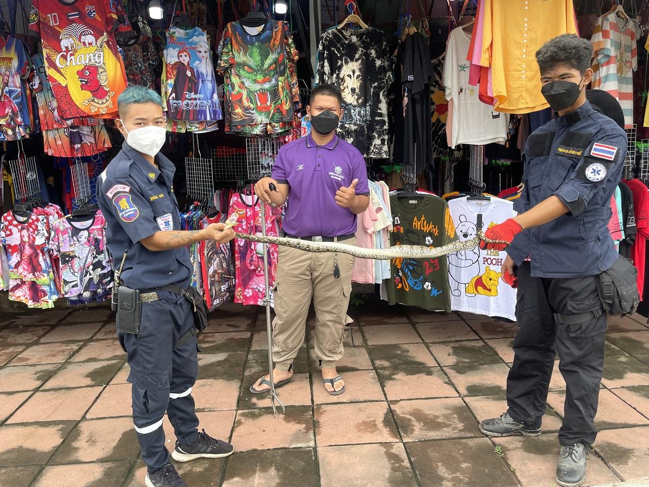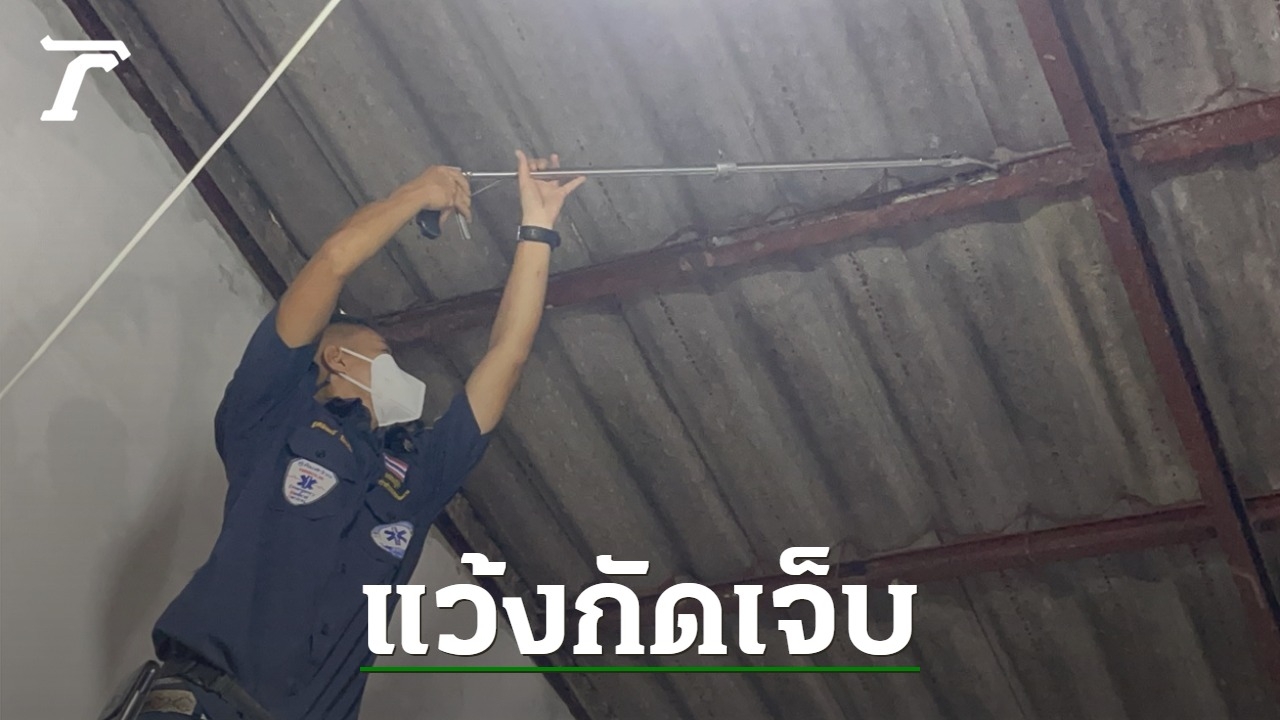กู้ภัยปีนจับ "งูเหลือม" แอบเลื้อนขึ้นไปบนขื่อหลังคาร้านขายเสื้อผ้าเด็ก ระหว่างจับโดนแว้งกัดได้รับบาดเจ็บ โชคดีไม่มีพิษ