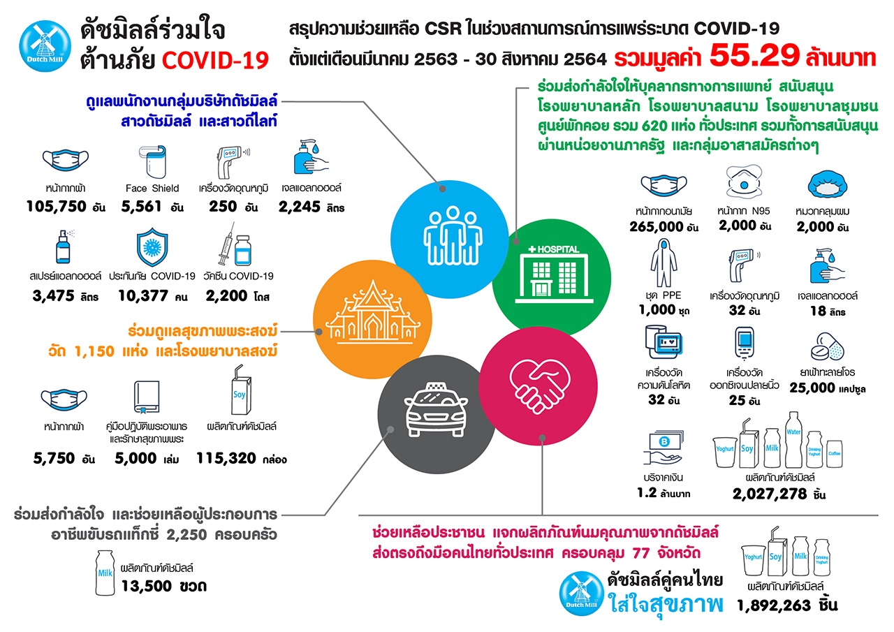 กลุ่มบริษัทดัชมิลล์ เดินหน้าสานต่อโครงการ “ดัชมิลล์ร่วมใจ ต้านภัย COVID-19” สนับสนุน Community & Home Isolation ส่งมอบความห่วงใยพร้อมสุขภาพดีด้วยผลิตภัณฑ์คุณภาพจากดัชมิลล์ ทั้งนมสด เครื่องดื่มวิตามินซี และน้ำดื่ม รวมกว่า 505,380 ชิ้น มูลค่า 4,873,800 บาท เพื่อช่วยเหลือผู้ป่วยโควิด-19 ในศูนย์พักคอย และกักตัวที่บ้าน สำหรับเสริมสร้างความแข็งแรง และเพิ่มภูมิต้านทาน ผ่านหน่วยงานภาครัฐ และกลุ่มอาสาสมัครต่างๆ โดยมุ่งเน้นที่ 6 จังหวัดในพื้นที่สีแดงเข้ม ได้แก่ กรุงเทพมหานคร, นนทบุรี, ปทุมธานี, สมุทรปราการ, นครปฐม และสมุทรสาคร ก่อนจะขยายผลช่วยเหลือทั่วประเทศ