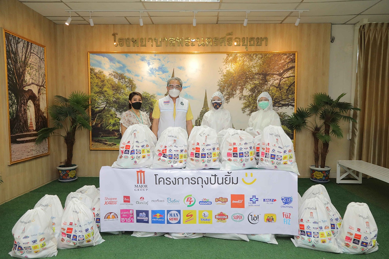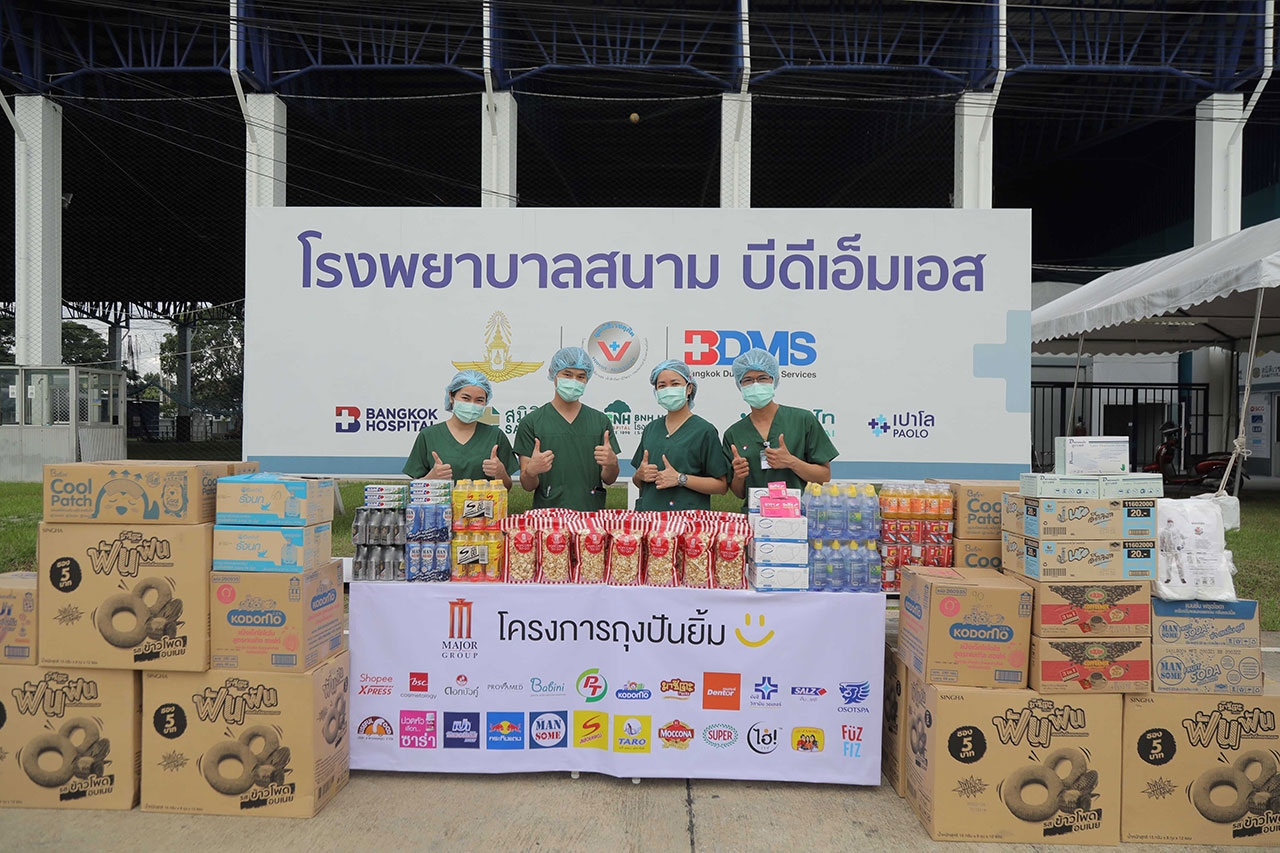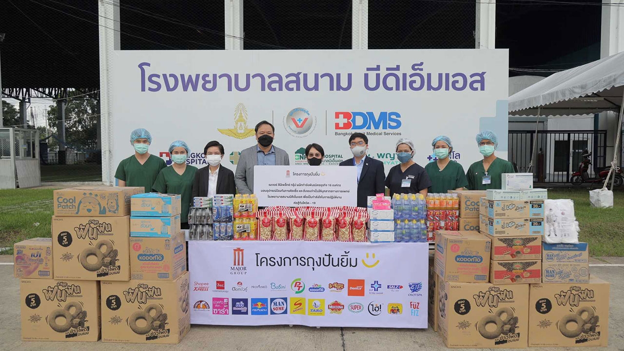 บริษัท เมเจอร์ ซีนีเพล็กซ์ กรุ้ป จำกัด (มหาชน) ผนึกกำลังพันธมิตรธุรกิจ 16 องค์กร ร่วมกันสานต่อโครงการถุงปันยิ้ม มอบอุปกรณ์ป้องกันการติดเชื้อ ได้แก่ ชุด PPE, หน้ากากอนามัย, ถุงมือยาง รวมทั้ง ป๊อปคอร์น และสิ่งของจำเป็นต่างๆ สำหรับใช้ทำความสะอาดให้กับบุคลากรการแพทย์ และเจ้าหน้าที่ที่ปฏิบัติงาน ณ โรงพยาบาลสนามบีดีเอ็มเอส สนามกีฬา ทอ. (ธูปะเตมีย์) เพื่อสนับสนุนการทำหน้าที่ดูแลรักษาผู้ป่วยโควิด-19 ตลอดจนเป็นกำลังใจ และแทนคำขอบคุณในความเสียสละของทุกท่าน โดยมี รศ.อัจจิมา เศรษฐบุตร กรรมการและเลขานุการมูลนิธิเวชดุสิตฯ เป็นผู้รับมอบ