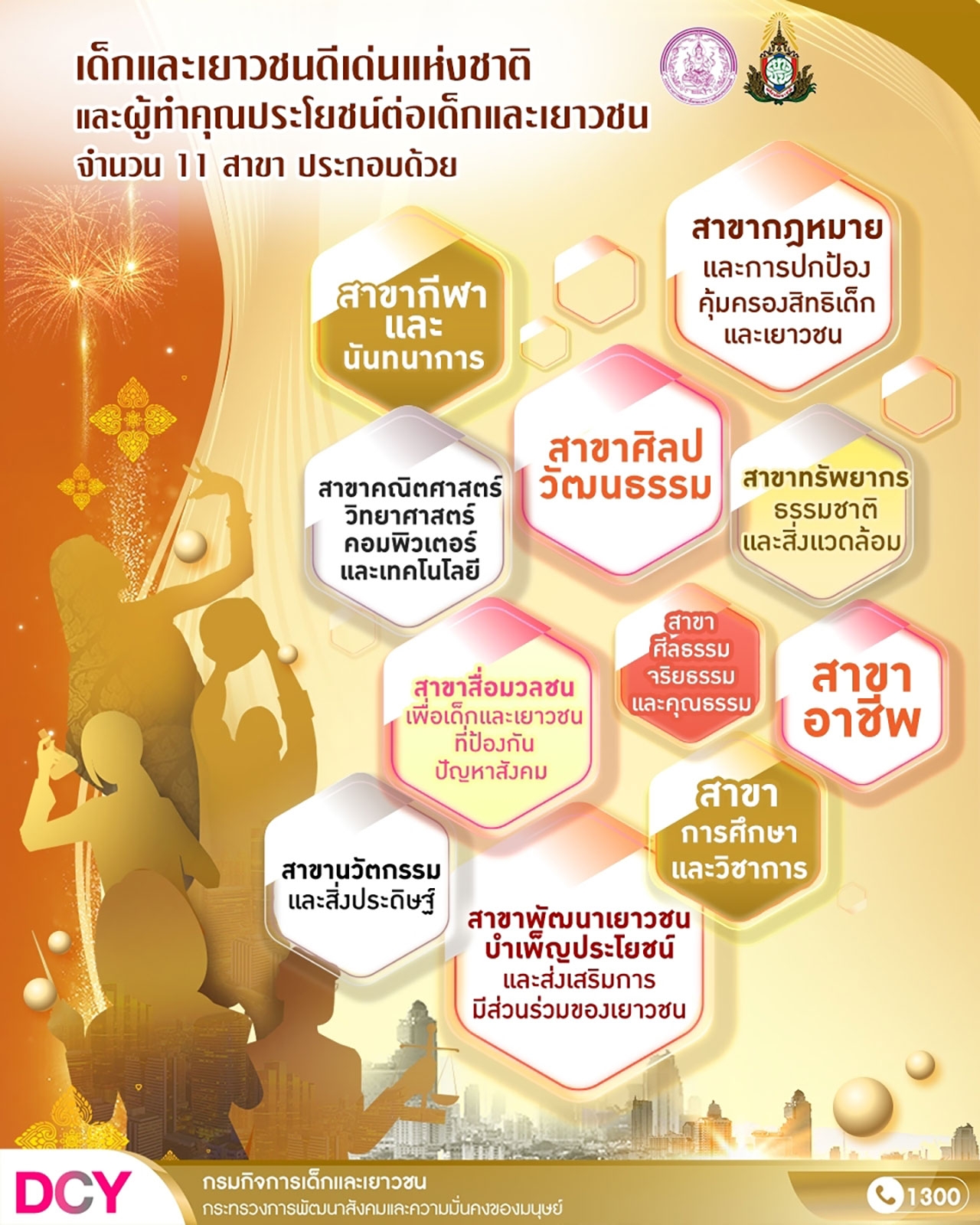 11. สาขาอาชีพ จำนวน 10 ราย ประเภทเด็กและเยาวชนดีเด่นแห่งชาติ นายกิตติศักดิ์ ยศพิบูลย์, นางสาวฐิตินันท์ บุญแก้ว, นายณรงค์ศักดิ์ ดวงแก้ว, นายณัฐพล คุณยศยิ่ง, นายธนทรัพย์ เครื่องสกุล, นายยศกร มณีทิพย์ และ นายนันทวัฒน์ เพ็ชรรักษ์ ประเภทกลุ่มเด็กและเยาวชนดีเด่นแห่งชาติ กลุ่มยุวเกษตรกร โรงเรียนท่าข้ามพิทยาคม และ กลุ่ม SPOTEC Indigo Handmade ประเภทองค์กรที่ทำคุณประโยชน์ต่อเด็กและเยาวชน บริษัท ดาว คอฟฟี่บีนส์ จำกัด