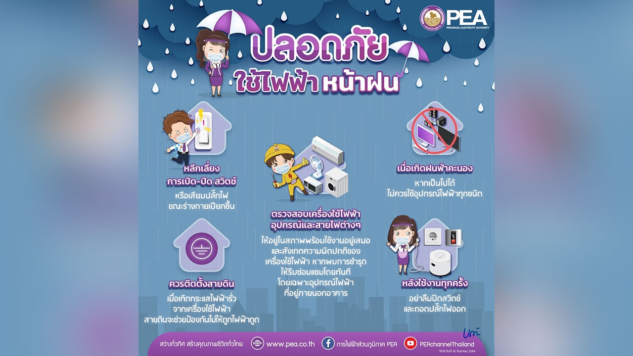การไฟฟ้าส่วนภูมิภาค (PEA) มีความห่วงใยในความปลอดภัยในชีวิตและทรัพย์สินของประชาชน เมื่อถึงฤดูฝนของทุกปี มักมีลมกรรโชกแรง เกิดพายุฝนฟ้าคะนอง และทำให้เกิดอุบัติภัยทางไฟฟ้าหรือเกิดอันตรายต่อชีวิตและทรัพย์สินของประชาชน เพื่อความปลอดภัย มีคำแนะนำวิธีการใช้ไฟฟ้าอย่างถูกต้องและปลอดภัยในช่วงฤดูฝน ดังนี้