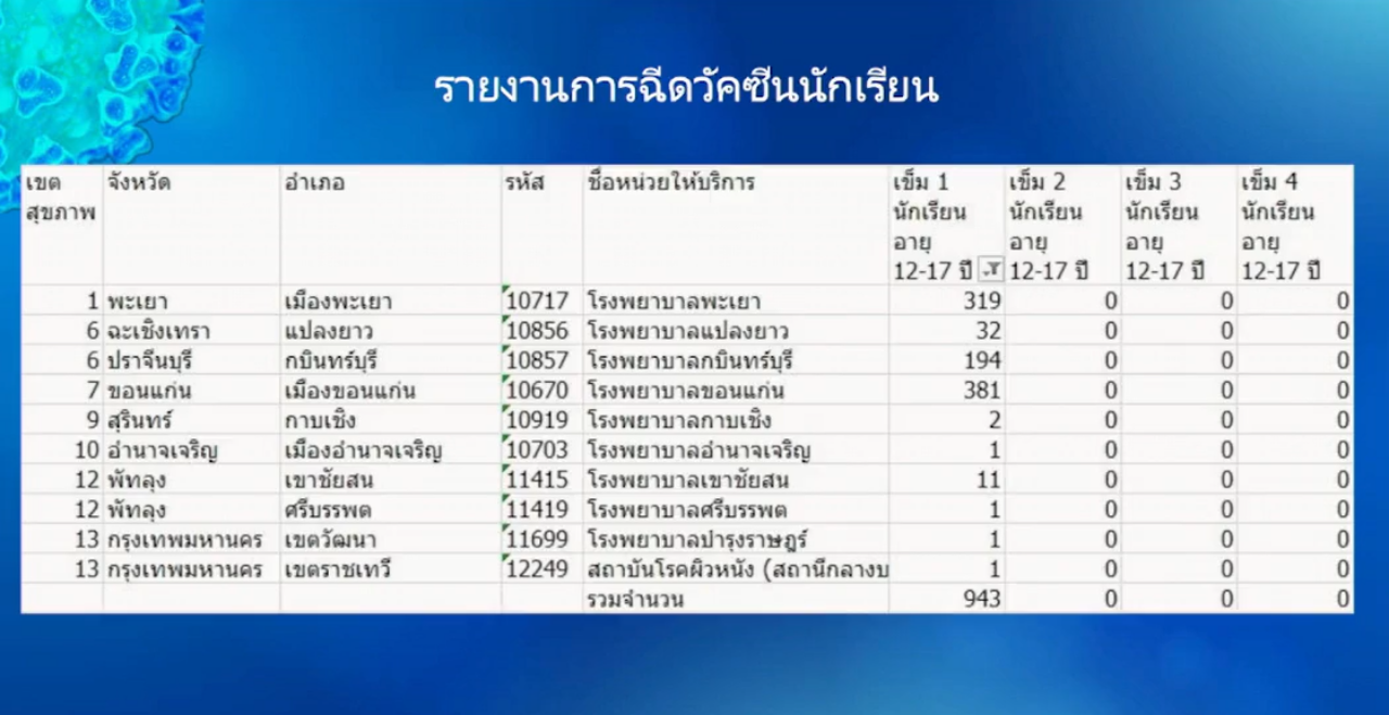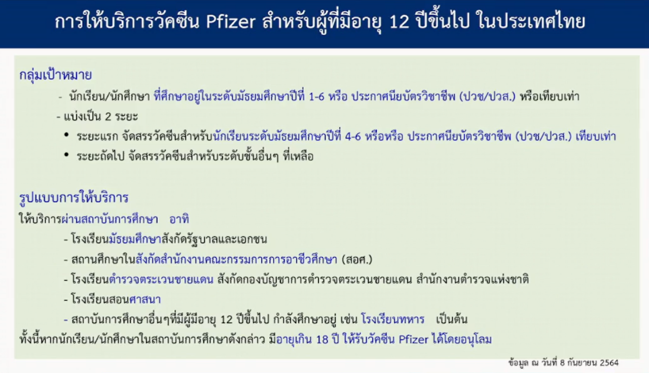 โดยในระยะแรกจะมีการจัดสรรให้นักเรียนระดับชั้น ม.1-3, ม.4-6, ปวช.-ปวส. หรือเทียบเท่า ซึ่งจะขึ้นอยู่กับความสะดวกของโรงเรียนนั้นๆ เพราะจะใช้โรงเรียนเป็นฐาน โดยมีกระทรวงสาธารณสุข กระทรวงศึกษาธิการ และจังหวัดเป็นผู้ควบคุมดูแล รวมถึงจะมีการกระจายวัคซีนไฟเซอร์ไปถึงเขตอำเภอ ซึ่งแตกต่างจากครั้งที่ผ่านมาที่ส่งไปให้จังหวัดแล้วให้เป็นผู้กระจายออกไป
