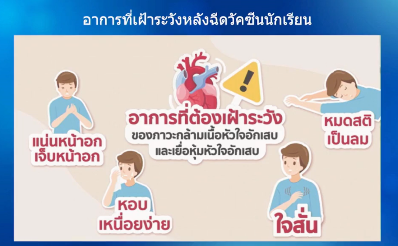 ทั้งนี้อาการข้างเคียงของการฉีดวัคซีนชนิด mRNA จากการเฝ้าระวังหลังการฉีดวัคซีนในเด็กนักเรียน คือ แน่นหน้าอก เจ็บหน้าอก หอบ เหนื่อยง่าย ใจสั่น และหมดสติเป็นลม หลังจากฉีดเข็มที่ 2 แต่จำนวนที่พบมีเพียง 4 คน ซึ่งถือว่าอยู่ในเกณฑ์มาตรฐานกับประเทศอื่นๆ ที่มีการบันทึกไว้ แต่ในภาพรวมประโยชน์ยังมีมากกว่าโทษและหากเด็กมีอาการหลังจากฉีดวัคซีน ขอให้ผู้ปกครองพาไปที่โรงพยาบาลเพื่อรับการรักษาอย่างเหมาะสม