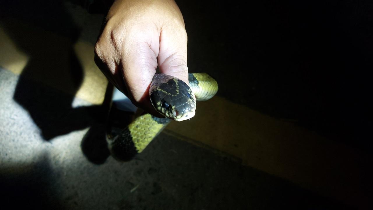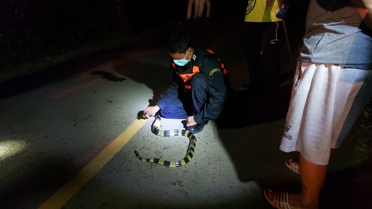 จากการสอบถามกับ นายบุญรอด คำดี อายุ 35 ปี กล่าวว่า ตนได้เลิกงานจากการทำงานมา และกลับเข้าบ้านไปแล้วนั้นตนนึกขึ้นได้ว่าตนยังไม่ปิดประตูรั้ว ตนจึงได้เปิดแฟลชจากโทรศัพท์เพื่อจะเดินไปปิดรั้วบ้าน แต่ก็ต้องตกใจเพราะพบงูสามเหลี่ยมขนาดใหญ่นอนขวางอยู่บริเวณทางเดิน ตนจึงรีบแจ้งเจ้าหน้าที่เข้ามาช่วยจับงูตัวดังกล่าว ตนรอดจากการถูกงูฉกอย่างหวุดหวิด เพราะว่ารอบแรกที่เดินเข้าบ้านไม่ได้เปิดไฟเพื่อดูทางเข้าบ้าน แต่พอตนจะไปปิดประตูรั้ว ตนได้เปิดแฟลชจึงพบงูตัวดังกล่าว