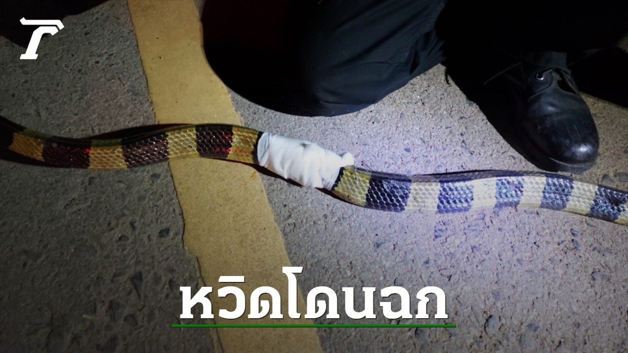 หนุ่มโรงงานเลิกงานกลับบ้านถึงกับผงะ เจอ "งูสามเหลี่ยม" อยู่บริเวณประตูบ้าน ร้องกู้ภัยช่วยจับด่วน