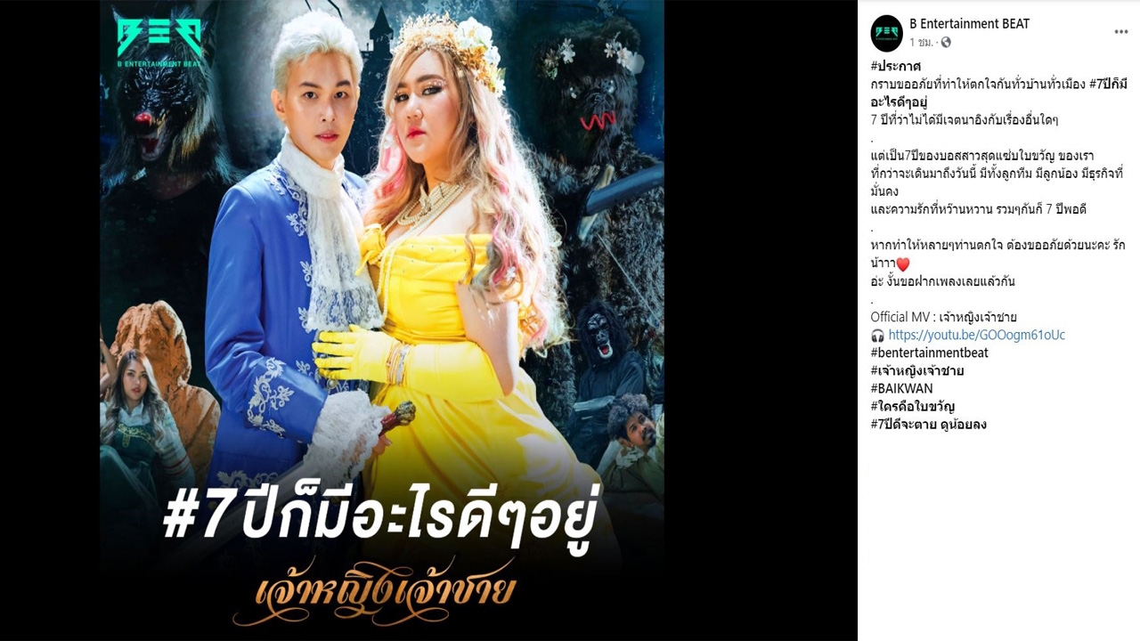 โดยเอ็มวีเพลงมาในคอนเซปต์ โฉมงามกับเจ้าชายอสูร เล่าเรื่องความรักดั่งเทพนิยายได้อย่างน่าติดตามกับโปรดักชั่นอลังการ ภายใต้คอนเซปต์ทุ่มไม่อั้น แถมยังจัดหนักจัดเต็ม ตามสไตล์สาวใบขวัญ บอกเลยว่า ห้ามพลาด! เพราะเพลงดีมีคุณภาพ เนื้อหาเพลงก็น่ารัก แถมดนตรียังฟังง่ายเป็นสไตล์ป๊อปติดหูอีกต่างหาก คาดว่าน่าจะเป็นอีกหนึ่งผลงานฮิตของสาวใบขวัญในอนาคตได้อย่างแน่นอน แฟนๆ สามารถเข้าไปฟังเพลง “เจ้าหญิงเจ้าชาย” พร้อมกันได้แล้ว ที่ช่อง B Entertainment BEAT ได้แล้ววันนี้ทุกช่องทาง.