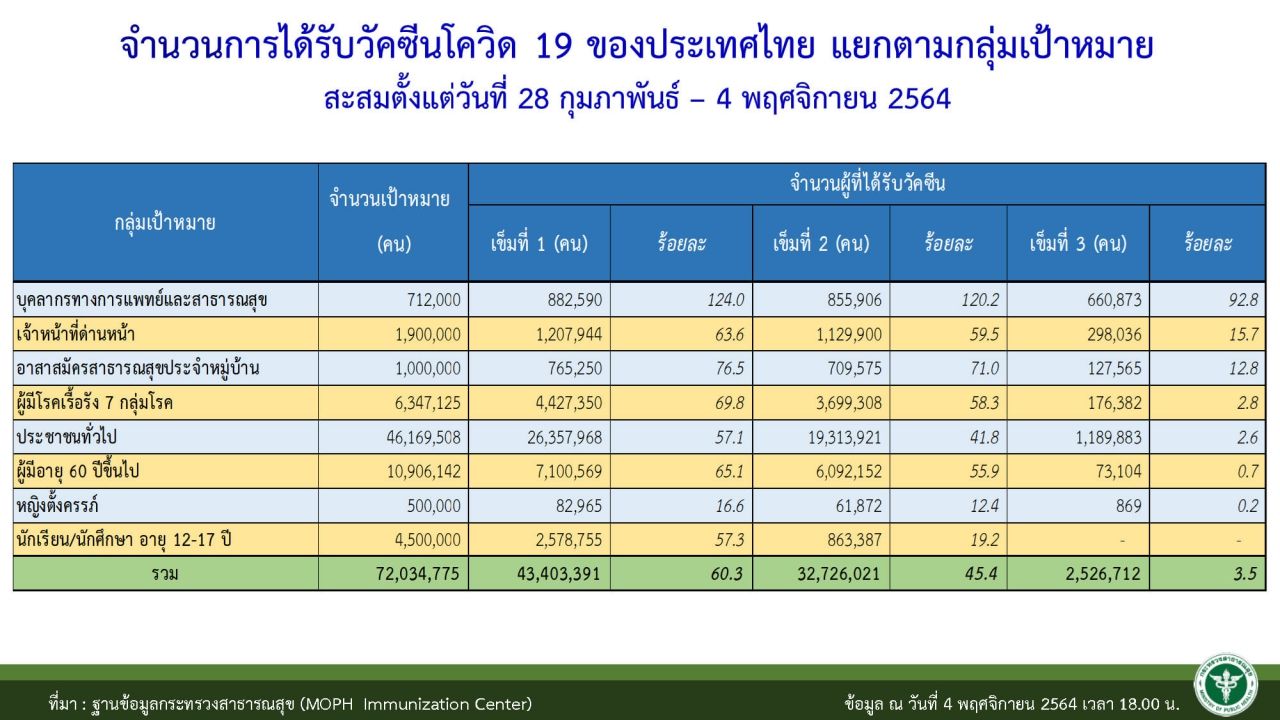 วันที่ 5 พ.ย. 2564 แพทย์หญิงสุมณี วัชรสินธุ์ ผู้อำนวยการสำนักสื่อสารความเสี่ยงและพัฒนาพฤติกรรมสุขภาพ กรมควบคุมโรค กระทรวงสาธารณสุข รายงานความคืบหน้าการฉีดวัคซีนโควิด-19 ในประเทศไทย มีข้อมูลเป็นดังนี้