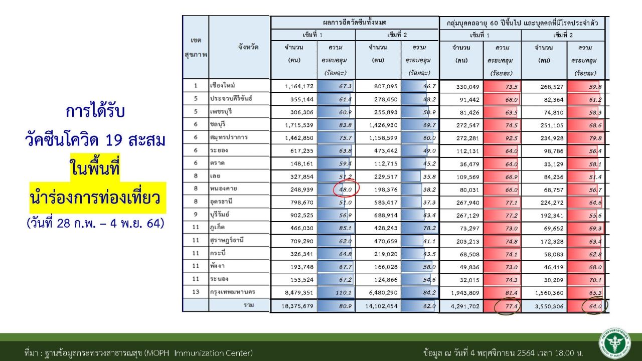ในส่วนของการรับวัคซีนโควิด-19 ในพื้นที่นำร่องท่องเที่ยว (พื้นที่สีฟ้า) 17 จังหวัด ค่าเฉลี่ยของเข็มแรกอยู่ที่ 80.9% และจังหวัดส่วนใหญ่ฉีดเข็มแรกเกิน 50% และเร่งฉีดเพิ่มขึ้นเรื่อยๆ แต่ จ.หนองคาย ฉีดเข็มแรกไปได้เพียง 48% ขอให้เร่งรัดการฉีดวัคซีนมากขึ้น นอกจากนี้ ยังขอให้กลุ่มเสี่ยง 608 ที่ประกอบด้วย ผู้ที่มีอายุ 60 ปีขึ้นไป, ผู้ป่วย 7 กลุ่มโรคเรื้อรัง และหญิงตั้งครรภ์ 12 สัปดาห์ขึ้นไป เข้ารับวัคซีนให้ได้เกิน 80%