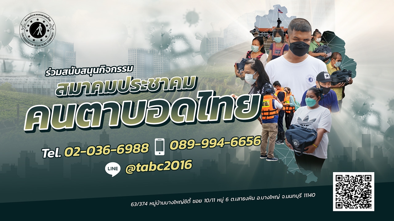 สมาคมประชาคมคนตาบอดไทย จึงขอเรียนเชิญทุกท่าน ร่วมช่วยเหลือเยียวยาคนตาบอดที่ได้รับผลกระทบจากพิษโควิด-19 โดยจะบริจาคเป็นสิ่งเป็นสิ่งของด้วยตนเองหรือจัดส่งทางไปรษณีย์ เช่น ข้าวสาร บะหมี่กึ่งสำเร็จรูป ปลากระป๋อง เจลแอลกอฮอล์ หน้ากากอนามัย แปรงสีฟัน ยาสีฟัน สบู่ ยาสระผม ผงซักฟอก ยาสามัญประจำบ้าน ฯลฯ ที่ศูนย์ประสานงานสมาคมประชาคมคนตาบอดไทย ณ 63/374 หมู่บ้านบางใหญ่ซิตี้ ซอย 10/11 หมู่ที่ 6 ตำบลเสาธงหิน อำเภอบางใหญ่ จังหวัดนนทบุรี 11140 สอบถามรายละเอียดโทร. 089-994-6656 หรือสอบถามข้อมูลเพิ่มเติมทางแอปพลิเคชันไลน์ ไอดีไลน์ @tabc2016 ร่วมช่วยเหลือคนตาบอดที่ได้รับผลกระทบจากพิษโควิด-19 และร่วมส่งกำลังใจให้พี่น้องคนตาบอดผ่านพ้นวิกฤติครั้งนี้ไปด้วยกัน