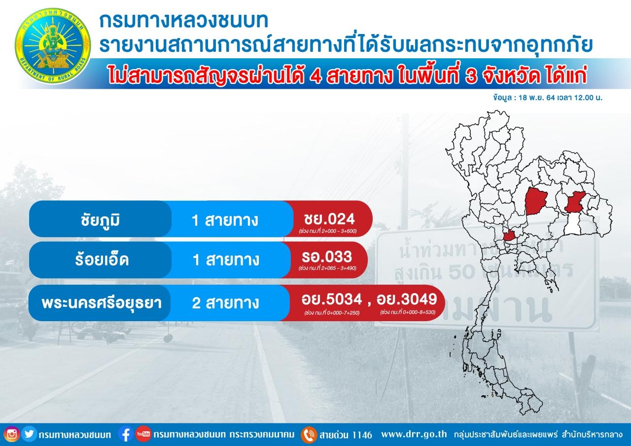 วันที่ 18 พ.ย. 2564 กรมทางหลวงชนบท (ทช.) กระทรวงคมนาคม โดยสำนักบำรุงทาง รายงานถึงสถานการณ์อุทกภัยประจำวัน เมื่อเวลา 17.00 น.ที่ผ่านมา มีถนนทางหลวงชนบทที่ประสบอุทกภัยในพื้นที่ 7 จังหวัด ได้แก่ พระนครศรีอยุธยา ชัยภูมิ สุรินทร์ มหาสารคาม ร้อยเอ็ด สุพรรณบุรี และนครปฐม รวม 19 สายทาง สามารถสัญจรผ่านได้ 15 สายทาง และไม่สามารถสัญจรผ่านได้ 4 สายทาง แบ่งเป็น น้ำท่วมสูง 3 สายทาง (3 แห่ง) ทางขาด โครงสร้างทางชำรุด กัดเซาะ 1 สายทาง (1 แห่ง) รายละเอียดดังนี้