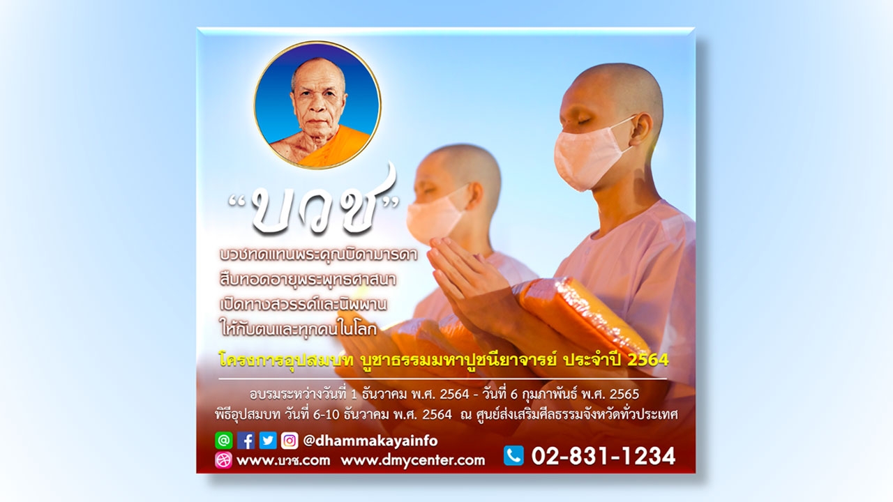 “การอุปสมบทบูชาธรรมมหาปูชนียาจารย์ประจำปี 2564 จัดขึ้นระหว่างวันที่ 1 ธันวาคม พ.ศ.2564-วันที่ 6 กุมภาพันธ์ พ.ศ.2565 อุปสมบท วันที่ 6-10 ธันวาคม พ.ศ. 2564 ณ วัดต่าง ๆ ทั่วประเทศ ภายใต้มาตรการสาธารณสุขป้องกันโรคโควิด-19 อย่างเคร่งครัด สมัครบวชได้ตั้งแต่วันนี้ ณ ศูนย์ส่งเสริมศีลธรรมทั่วประเทศ หรือสมัครออนไลน์ที่ www.บวช.com และ www.dmycenter.com สอบถามเพิ่มเติมหมายเลขโทรศัพท์ Call Center 02-831-1234” พระครูสมุห์สนิทวงศ์กล่าว