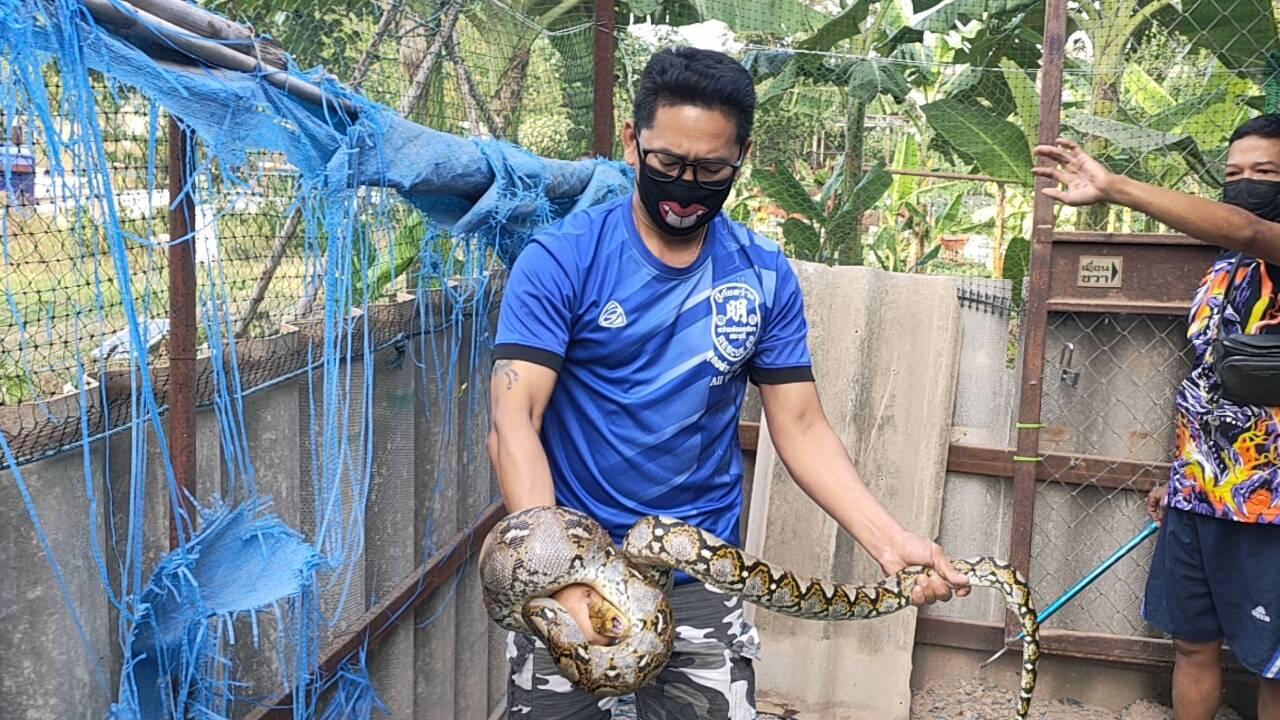 ในที่เกิดเหตุพบว่า งูเหลือม ขนาดใหญ่ นอนขดตัวอยู่ตรงบริเวณซอกเล้าไก่ ไม่สามารถเลื้อยไปไหนได้ เนื่องจากได้กินลูกไก่ชน อายุประมาณ 4 เดือนไปแล้ว 4 ตัว จึงทำให้ท้องป่อง จากนั้นเจ้าหน้าที่กู้ภัยฯ ได้ใช้อุปกรณ์ในการจับงู กดไปที่หัวงู แล้วใช้มือจับกดไปที่หัวงูเหลือม งูได้ขดตัวพันรัดมือ เจ้าหน้าที่กู้ภัยฯอีกคนจึงได้เข้าไปช่วยจับที่หางของงู และคลายตัวงูออก