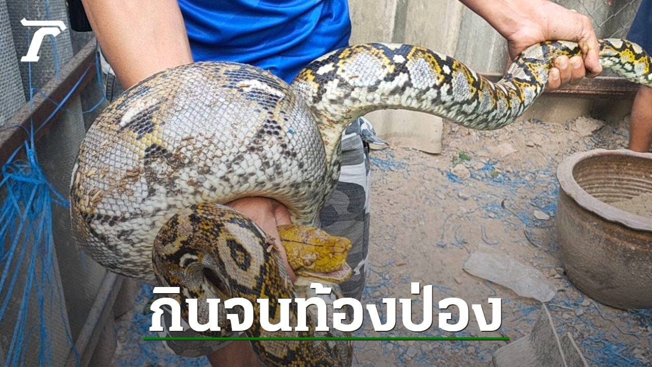 กู้ภัยจับ "งูเหลือม" ตัวใหญ่ แอบซอกเล้าไก่ เขมือบลูกไก่ชนราคาแพง สุดท้ายท้องป่องเลื้อยไม่ไหว