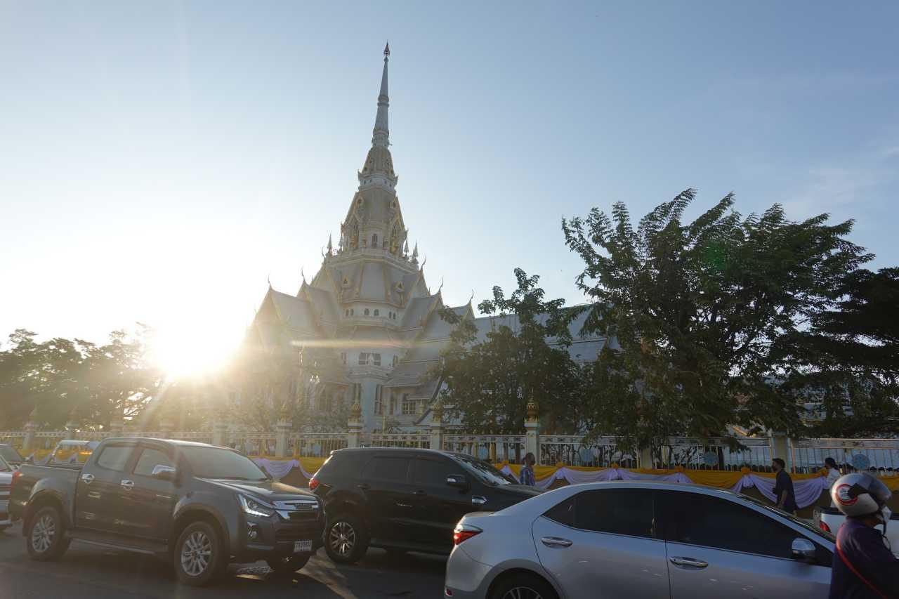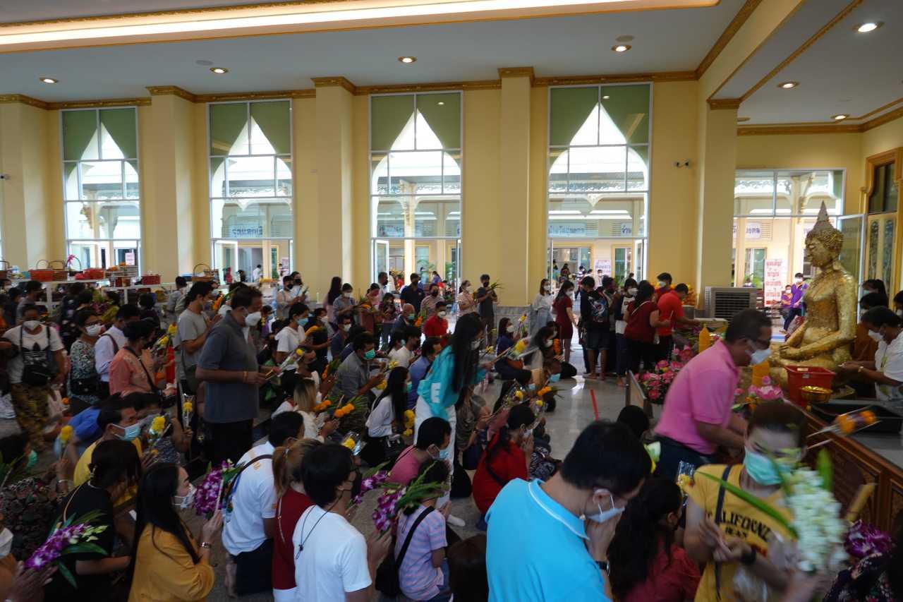 ส่วนที่พระอุโบสถที่ประดิษฐานองค์หลวงพ่อพุทธโสธรองค์จำลอง ก็มีประชาชนเดินทางมาสักการะขอพรเป็นจำนวนมากเช่นกัน ทางวัดได้มีการตรวจวัดอุณหภูมิประชาชนที่เข้าไปกราบหลวงพ่อโสธรทุกคน โดยแม่ค้าที่ขายของอยู่บริเวณวัดบอกว่า มีประชาชนเดินทางมาตั้งแต่ตี 3 เป็นจำนวนมาก เพื่อมารอไหว้หลวงพ่อโสธร โดยเปิดให้สักการะเวลา 07.00 น. ซึ่งทำให้การจราจรเส้นทางที่จะมาวัดนั้นติดขัด เวลา 07.30 น.มีพิธีทำบุญตักบาตรข้าวสารอาหารแห้งแด่พระภิกษุและสามเณร จำนวน 349 รูป รอบ พระอุโบสถวัดโสธรวรารามวรวิหาร