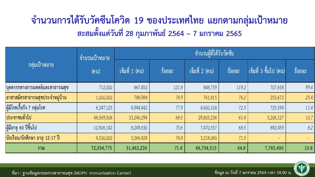 - ผู้ได้รับวัคซีนเข็มที่ 1 จำนวน 51,463,230 ราย (คิดเป็น 71.4% ของประชากร)