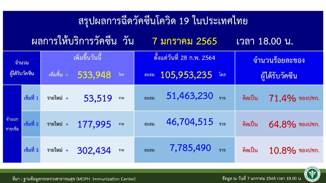 สำหรับการรายงานข้อมูลการฉีดวัคซีนในภาพรวม ณ วันที่ 7 ม.ค. 2565 เวลา 18.00 น. เพิ่มขึ้น 533,948 โดส