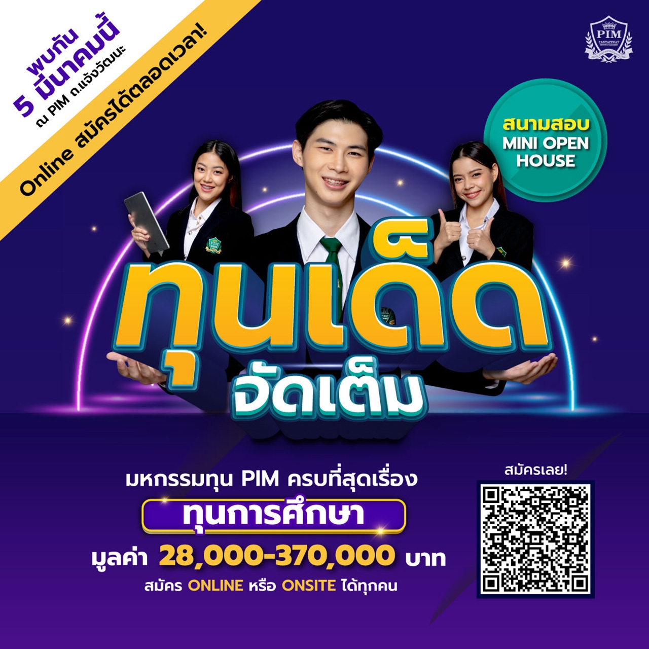 พีไอเอ็มขอเชิญชวนน้องๆ ชั้นมัธยมศึกษาปีที่ 6 หรือเทียบเท่า / ปวช.-ปวส. และ กศน. ที่สนใจศึกษาต่อระดับปริญญาตรี ร่วมงาน “มหกรรมทุน PIM ครบที่สุดเรื่องทุนการศึกษา” สนามสอบ #DEK65 สามารถสมัคร online หรือ onsite สมัครฟรี สอบฟรี ไม่ตัดสิทธิ์ TCAS พร้อมชิงทุนการศึกษาปริญญาตรีตั้งแต่ 28,000-370,000 บาท พิเศษกับกิจกรรม Mini Open House เปิดบ้านพาทัวร์พีไอเอ็ม ชมห้องฝึกปฏิบัติการสุดล้ำ เพื่อค้นหาตัวตนเลือกเรียนตามความสนใจในหลายสาขาวิชา อาทิ การจัดการธุรกิจการบิน อุตสาหกรรมการบริการและการท่องเที่ยว การจัดการโลจิสติกส์และคมนาคมขนส่ง ภาษาญี่ปุ่นธุรกิจ ภาษาอังกฤษเพื่อการสื่อสารทางธุรกิจ การสอนภาษาจีน นิเทศศาสตร์ การบริหารทรัพยากรมนุษย์และการจัดการองค์การ การจัดการอสังหาริมทรัพย์และทรัพย์สินอาคาร วิศวกรรมศาสตร์และเทคโนโลยี เกษตรนวัตและการจัดการ การจัดการธุรกิจอาหาร บริหารธุรกิจ และสาขาอื่นๆ อีกเพียบ พร้อมปรึกษาการเรียน เส้นทางอาชีพในอนาคต จากพี่ๆ แนะแนว ในวันเสาร์ที่ 5 มีนาคม 2565 เวลา 09.00-15.00 น. ณ สถาบันการจัดการปัญญาภิวัฒน์ ถนนแจ้งวัฒนะ