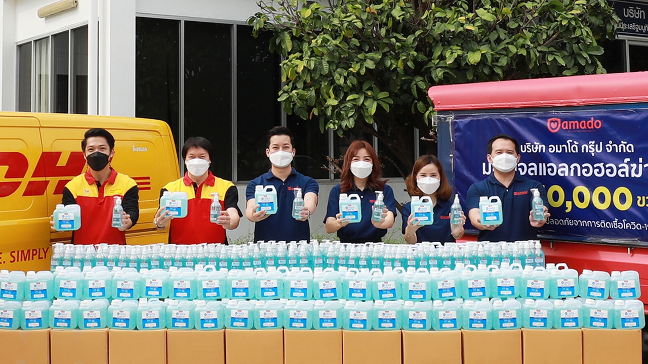 นายธนาตรัยฉัตร ภูโชคอนันต์ ประธานเจ้าหน้าที่บริหาร บริษัท อมาโด้ กรุ๊ป จำกัด (ที่ 3 จากซ้าย) พร้อมด้วยคณะผู้บริหาร คิกออฟมอบเจลแอลกอฮอล์ฆ่าเชื้อกว่า 150,000 ขวด รวมกว่า 75,000 ลิตร ให้แก่มูลนิธิ โรงเรียน โรงพยาบาล หน่วยงานต่างๆ และประชาชนทั่วภูมิภาค เพื่อป้องกันและรับมือการแพร่เชื้อของโรคโควิด-19 ระลอกที่ 5 และสนับสนุนการปฏิบัติงานของหน่วยงานต่างๆ ทั่วประเทศ โดยมี นายเกียรติชัย พิตรปรีชา ประธานเจ้าหน้าที่บริหาร บริษัท ดีเอชแอล อีคอมเมิร์ซ โซลูชั่นส์ ภูมิภาคเอเชียตะวันออกเฉียงใต้ เป็นพันธมิตรร่วมจัดส่งแอลกอฮอล์ไปยังพื้นที่ต่างจังหวัด ณ คลังสินค้าอมาโด้ ถนนประเสริฐมนูกิจ เมื่อเร็วๆ นี้