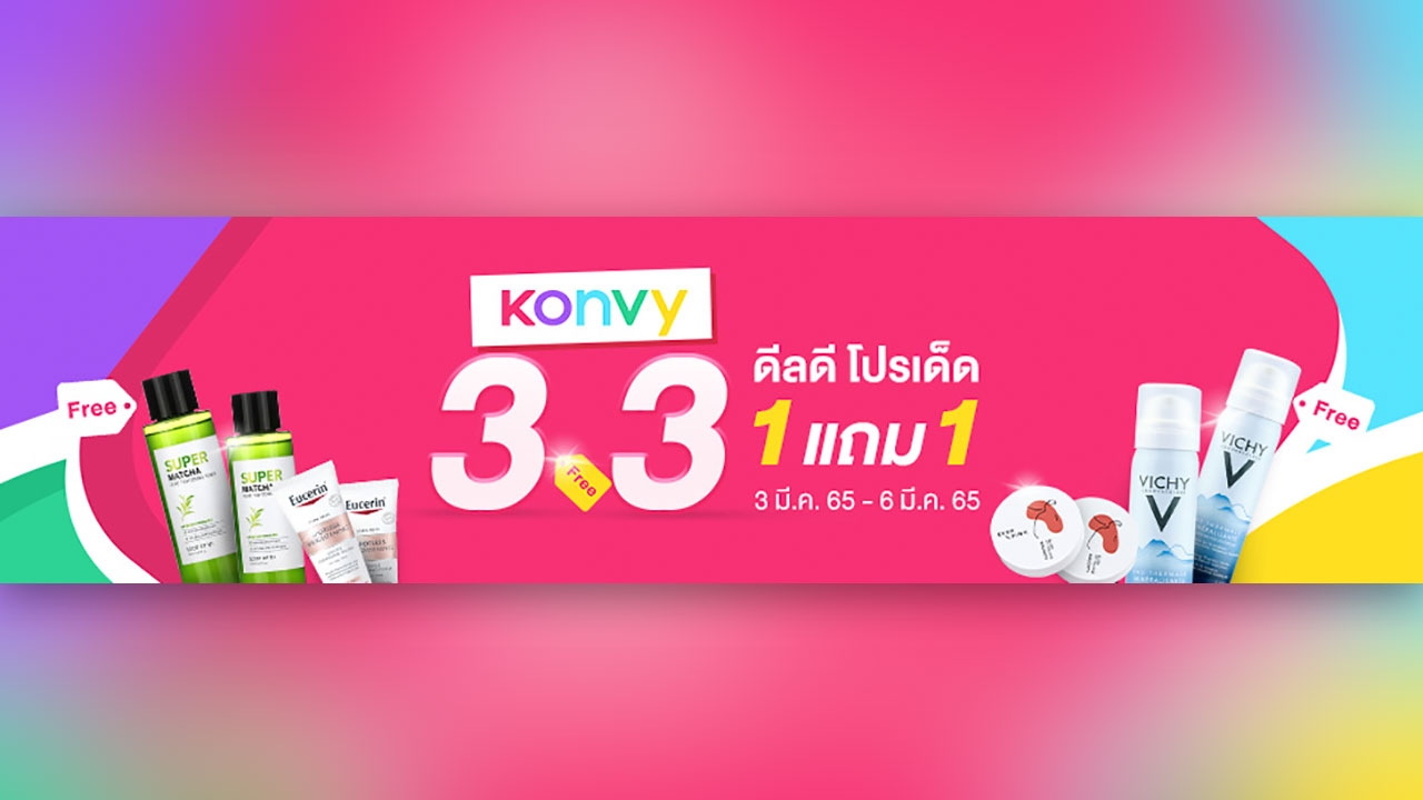 สวยไม่หยุดกับดีลสุดปังกับ Konvy 3.3 ดีลดี โปรเด็ด ซื้อ 1 แถม 1 คุ้มแบบเบิ้ลเบิ้ล ด้วยโปรโมชันจัดหนักจัดเต็มที่ทุกคนห้ามพลาด ยกขบวนมาลดกันทั้งออนไลน์ ใครเล็งชิ้นไหนไว้ ไม่ต้องลังเลกันอีกแล้ว หรือสาวๆ คนไหนที่รอตุนของเด็ดทั้งเมคอัพ และสกินแคร์ ที่เขาว่าดี บอกเลยว่าคุ้มค่าและราคาประหยัดแน่นอน เตรียมไปชอปสนุกกันแบบนอนสตอปยาวๆ ได้ตั้งแต่วันที่ 3 มีนาคม – 6 มีนาคม 2565