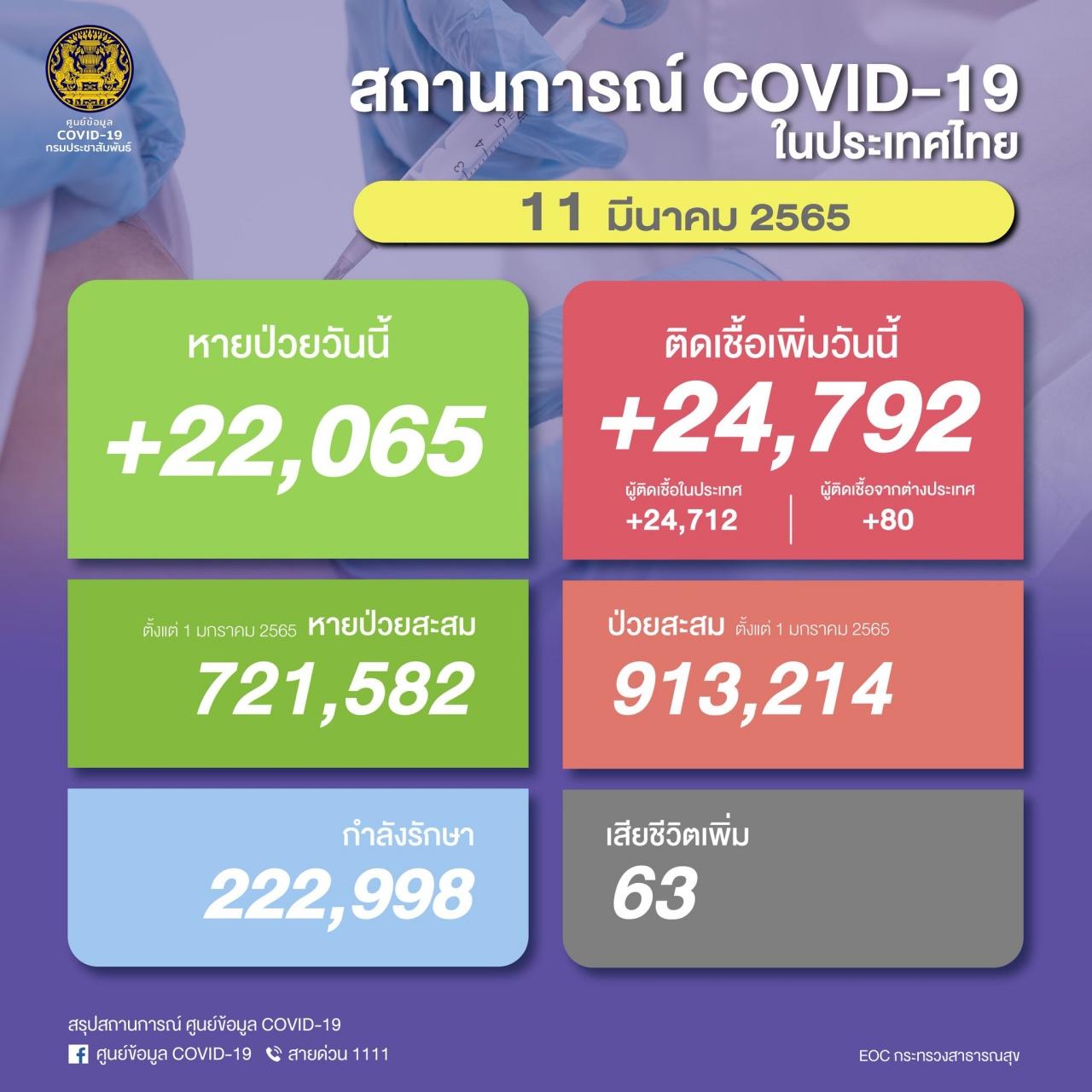 ผู้สื่อข่าวรายงานว่า กระทรวงสาธารณสุขได้รายงานสถานการณ์ "โควิด-19" ประจำวันเบื้องต้น โดยข้อมูล ณ วันที่ 11 มีนาคม 2565 มีผู้ป่วยติดเชื้อรายใหม่ 24,792 ราย จำแนกเป็น ผู้ติดเชื้อในประเทศ 24,712 ราย และผู้ป่วยมาจากต่างประเทศ 80 ราย ผู้ป่วยสะสม 913,214 ราย
