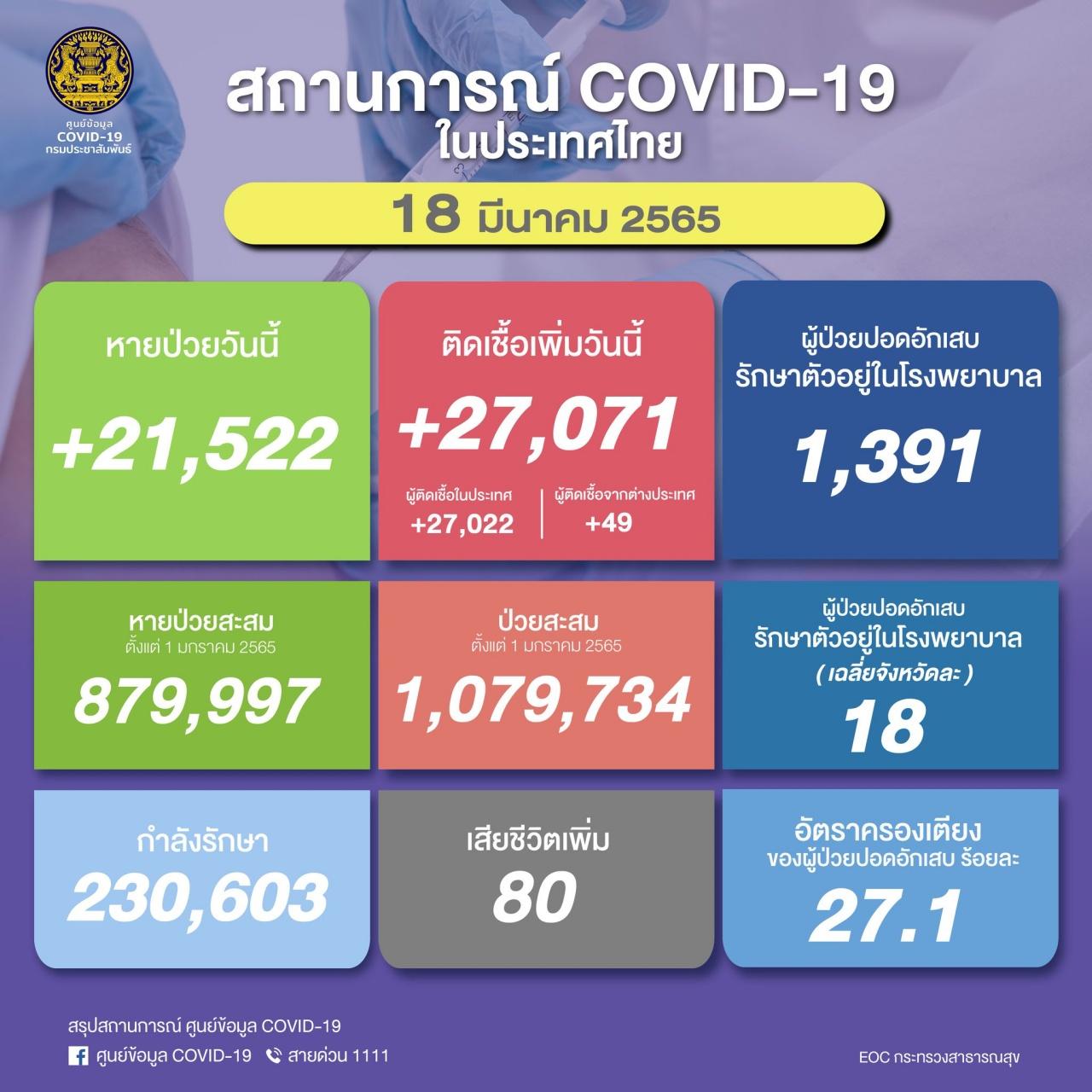 ผู้สื่อข่าวรายงานว่า กระทรวงสาธารณสุขได้รายงานสถานการณ์ "โควิด-19" ประจำวันเบื้องต้น โดยข้อมูล ณ วันที่ 18 มีนาคม 2565 มีผู้ป่วยติดเชื้อรายใหม่ 27,071 ราย จำแนกเป็น ผู้ติดเชื้อในประเทศ 27,022 ราย และผู้ป่วยมาจากต่างประเทศ 49 ราย ผู้ป่วยสะสม 1,079,734 ราย