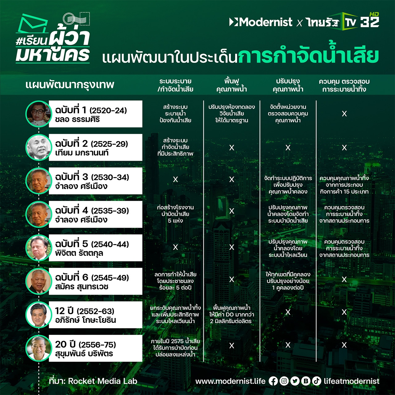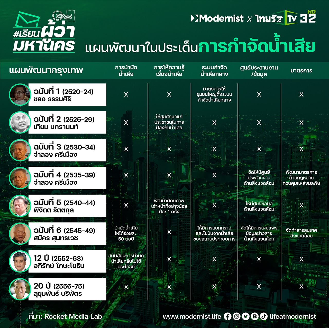 ถ้าย้อนกลับไปเมื่อปี 2520 กรุงเทพมหานครเริ่มมีแผนพัฒนากรุงเทพฯ ฉบับที่ 1 ซึ่งลงนามโดย ชลอ ธรรมศิริ พบว่ามีนโยบายการกำจัดน้ำเสีย ได้แก่ การสร้างระบบระบายน้ำป้องกันน้ำเสีย สร้างโรงขจัดน้ำเสีย, ปรับปรุงห้องปฏิบัติการทดลองวิจัยน้ำเสียของกรุงเทพฯ ให้ได้มาตรฐาน และการจัดตั้งหน่วยงานตรวจสอบควบคุมคุณภาพน้ำตามคูคลองต่างๆ ซึ่งจนผ่านเวลาไปถึงปี 2565 ก็มีแผนพัฒนากรุงเทพฯ ฉบับที่ 2 ที่ลงนามโดย เทียม มกรานนท์ มีนโยบายเพียงแค่การสร้างระบบกำจัดน้ำเสียที่มีประสิทธิภาพ และการให้สุขศึกษาและประชาสัมพันธ์แก่ประชาชนในการให้ความร่วมมือป้องกันน้ำเสีย จนมาถึงในยุคของ จำลอง ศรีเมือง ซึ่งลงนามในแผนพัฒนากรุงเทพฯ ฉบับที่ 3 - 4 (ฉบับที่ 3 บังคับใช้ในปี 2530-2534 และฉบับที่ 4 บังคับใช้ในปี 2535-2539) มีนโยบายที่แตกต่างกันไปในแต่ละแผน เช่นแผนฉบับที่ 3 มีโครงการจัดทำแผนระบบปฏิบัติการเพื่อปรับปรุงคุณภาพน้ำคลอง และควบคุมคุณภาพน้ำทิ้งจากการประกอบกิจการค้าที่มีการปล่อยน้ำเสียมาก 15 ประเภท ส่วนแผนฉบับที่ 4 นั้นมีการเพิ่มการก่อสร้างโรงงานบำบัดน้ำเสียใหม่ 5 แห่ง ซึ่งลงทุนโดยกรุงเทพมหานคร และรัฐบาล รวมถึงให้เอกชนดำเนินการก่อสร้างอีก 11 แห่ง, ปรับปรุงคุณภาพน้ำคลองโดยจัดทำระบบบำบัดน้ำเสีย ปรับปรุงระบบไหลเวียนน้ำ และขุดลอกคูคลอง รวมถึงการตรวจสอบการระบายน้ำทิ้งจากสถานประกอบการ การจัดตั้งศูนย์ประสานงานดำเนินการด้านสิ่งแวดล้อม และพัฒนามาตรการด้านกฎหมายให้กรุงเทพดำเนินการควบคุมแหล่งก่อมลพิษได้