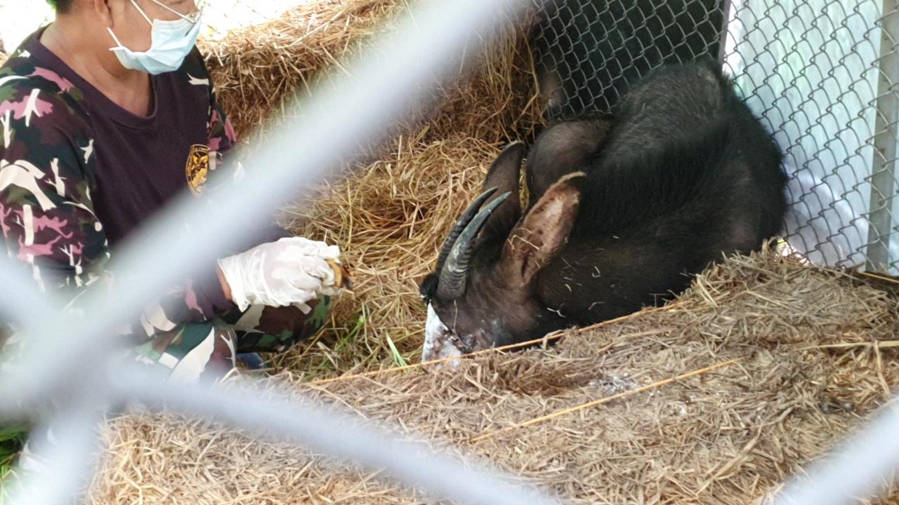 โดยหมอโบว์ บอกว่า อัตราการรอดค่อนข้างต่ำ แต่ถือว่าสัตว์มันสู้มาแล้วระดับหนึ่ง เราก็สู้เหมือนกัน สอบถามเบื้องต้นทราบว่า หลังจากเจ้าหน้าที่นำส่งมาให้ที่ศูนย์ช่วยเหลือ สภาพเลียงผา ไม่มีเนื้อเยื่อที่ใบหน้าเหลือแล้ว มีหนอนไขค่อนข้างมาก ร่างกายอ่อนแอ ดวงตาข้างซ้ายหายไป ส่วนดวงตาข้างขวามีหนอนไชอยู่บ้าง ประเมินเบื้องต้นคาดว่าอาจจะยังใช้การได้แต่อาจไม่ 100%