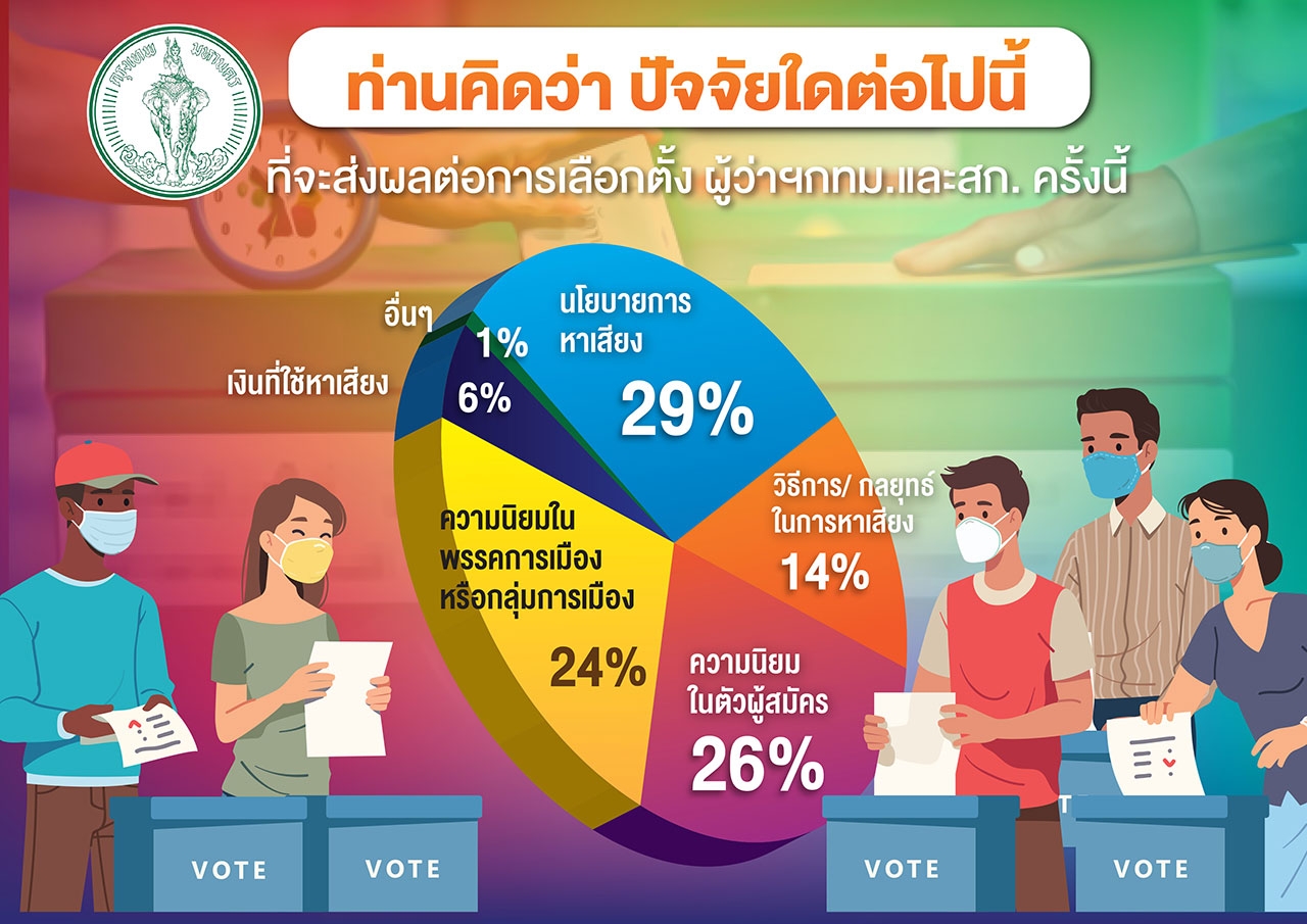 ขณะที่ปัจจัยที่จะส่งผลต่อการเลือกตั้งผู้ว่าฯ กทม. และ ส.ก. ในครั้งนี้คืออะไร กลุ่มตัวอย่างจำนวนมากที่สุด ร้อยละ 29 ตอบว่า คือนโยบายที่ใช้ในการหาเสียง รองลงมา จำนวนร้อยละ 26 คือ ความนิยมในตัวผู้สมัคร จำนวนร้อยละ 24 คือ ความนิยมในพรรคการเมืองหรือกลุ่มการเมือง จำนวนร้อยละ 14 คือ วิธีการและกลยุทธ์ในการหาเสียง จำนวนร้อยละ 6 คือ จำนวนเงินที่ใช้ในการหาเสียง และลำดับสุดท้าย ร้อยละ 1 คือ ปัจจัยจากส่วนอื่นๆ