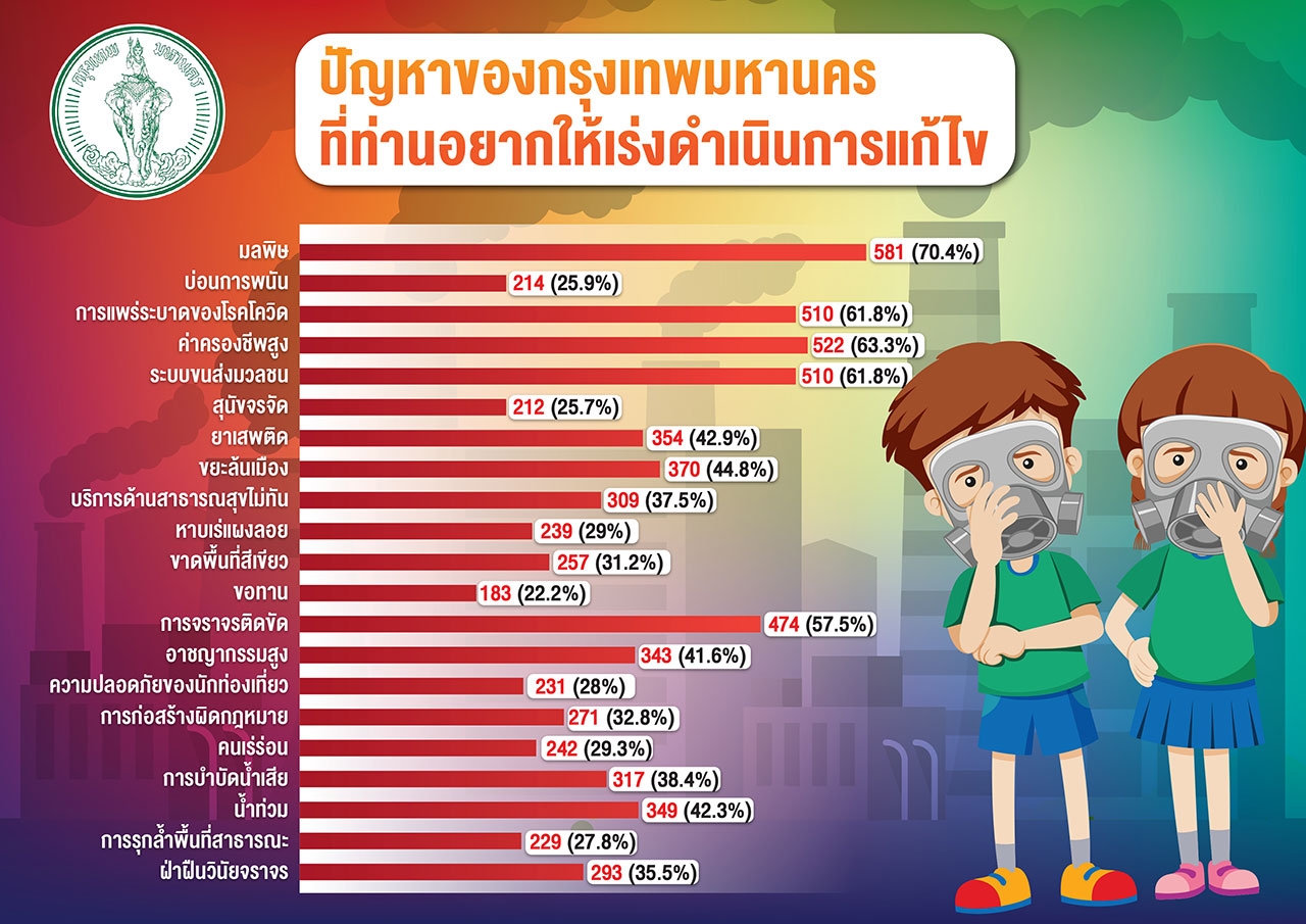 ส่วนปัญหาที่ชาว กทม.ต้องการให้มีการแก้ไขมากที่สุดอันดับหนึ่ง คือ ปัญหาเรื่องมลพิษ อันดับที่สอง คือ ปัญหาเรื่องค่าครองชีพที่สูง ลำดับที่สามและสี่เท่ากันคือ ระบบขนส่งมวลชนที่ขาดประสิทธิภาพ และปัญหาการแพร่ระบาดของโรคโควิด-19 ลำดับที่ห้าคือปัญหาการจราจรติดขัด ลำดับที่หกปัญหาเรื่องขยะล้นเมือง ลำดับที่เจ็ด การแพร่ระบาดของยาเสพติด ลำดับที่แปด ปัญหาเรื่องน้ำท่วม ลำดับที่เก้า ปัญหาอาชญากรรม นอกจากนี้ยังมีปัญหาการขาดพื้นที่สีเขียว การฝ่าฝืนวินัยจราจร ความปลอดภัยของนักท่องเที่ยว การก่อสร้างผิดกฎหมาย การบำบัดน้ำเสีย คนเร่ร่อน ขอทาน รวมไปถึงปัญหาสุนัขจรจัด
