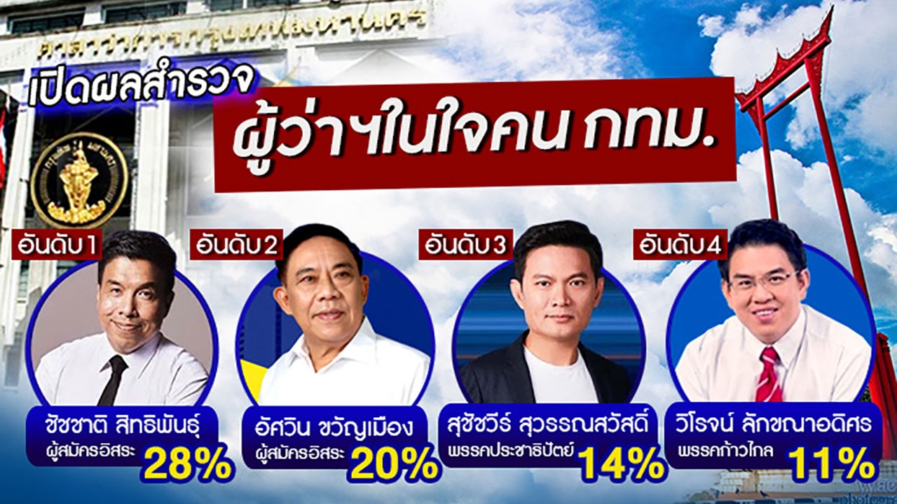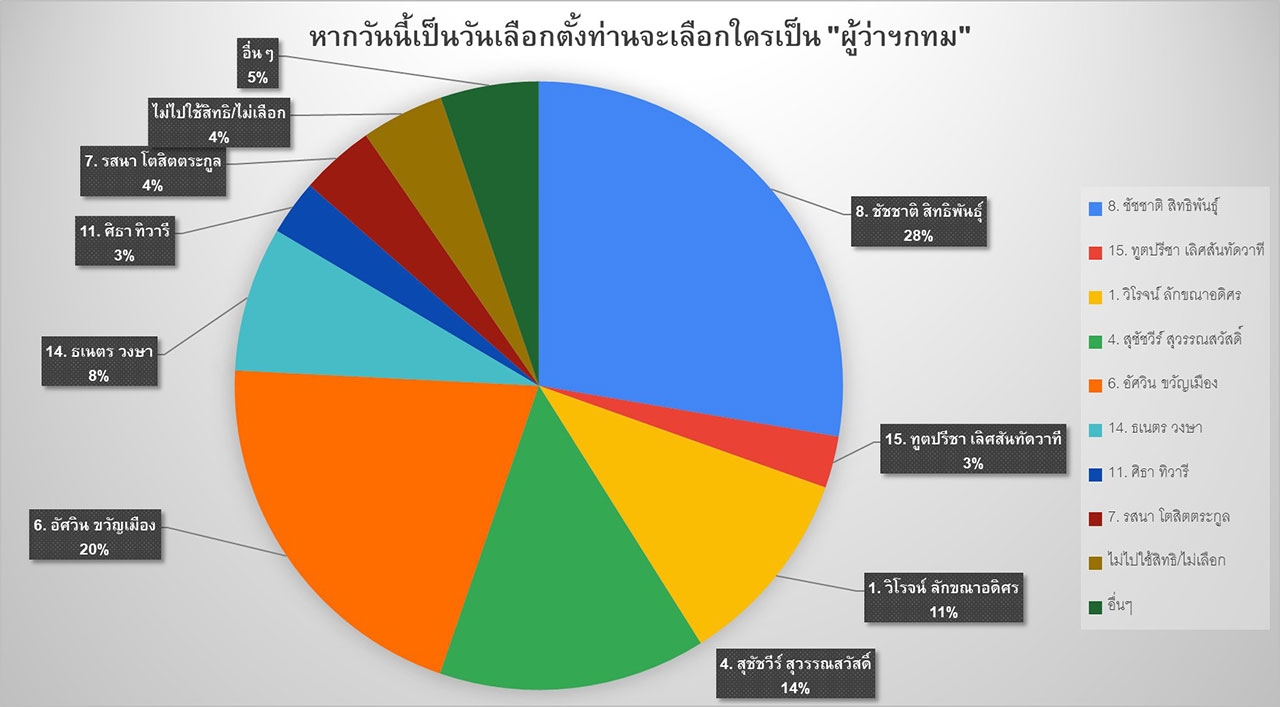 นอกจากนี้ ดร.ธนสุวิทย์ ยังเปิดเผยเกี่ยวกับ การทำผลสำรวจแบบคำถามเดียว ในหัวข้อ หากวันนี้เป็นวันเลือกตั้ง ท่านจะเลือกใครเป็น “ผู้ว่าฯ กทม.” กลุ่มตัวอย่างตอบและสรุปผลดังนี้ หมายเลข 8 นายชัชชาติ สิทธิพันธุ์ 28% หมายเลข 6 พล.ต.อ.อัศวิน ขวัญเมือง 20% หมายเลข 4 ศ.ดร.สุชัชวีร์ สุวรรณสวัสดิ์ 14% หมายเลข 1 นายวิโรจน์ ลักขณาอดิศร 11% หมายเลข 14 นายธเนตร วงษา 8% อื่นๆ (ยังไม่ตัดสินใจเลือกท่านใด) 5% ไม่ไปใช้สิทธิ/ไม่เลือก 4% หมายเลข 7 นางสาวรสนา โตสิตระกูล 4% หมายเลข 11 น.ต.ศิธา ทิวารี 3% และหมายเลข 15 พล.อ.ต.ทูตปรีชา เลิศสันทัดวาที 3%