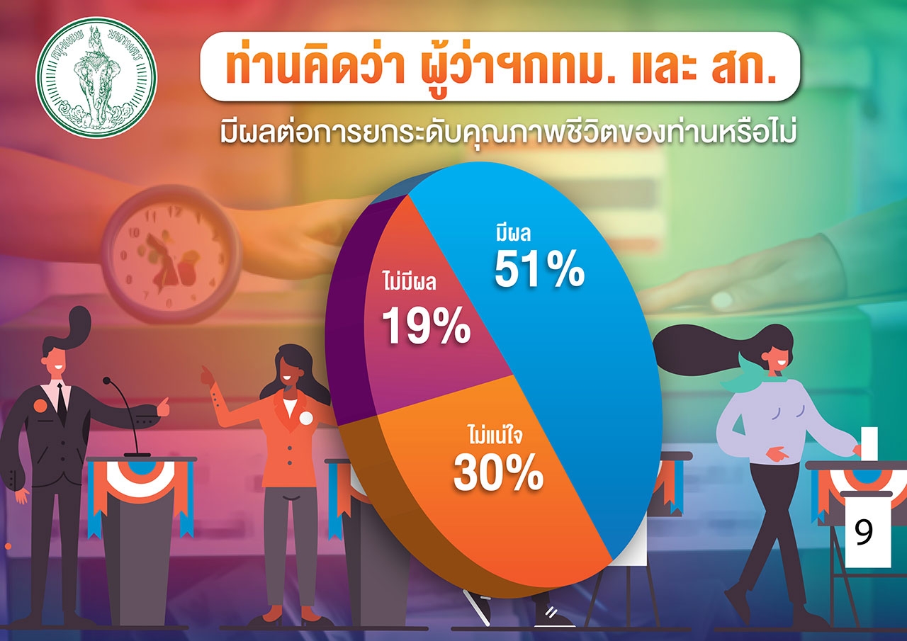 เมื่อถามว่า ผู้ว่าฯ กทม. และ ส.ก. มีผลต่อการยกระดับคุณภาพชีวิตของชาวเมืองหลวงหรือไม่ กลุ่มตัวอย่างร้อยละ 51 ตอบว่า มีผล รองลงมาร้อยละ 30 ตอบว่า ไม่แน่ใจ และร้อยละ 19 ของกลุ่มตัวอย่างตอบว่า ไม่มีผลแต่อย่างใด