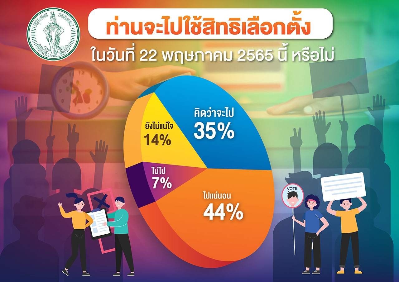 โดยผลสำรวจที่เกิดขึ้นสามารถสรุปสาระสำคัญๆ ดังนี้ เกี่ยวกับการรับรู้ของประชาชนต่อการเลือกตั้งผู้ว่าฯ กทม.และส.ก.ในครั้งนี้ กลุ่มตัวอย่างร้อยละ 78 ตอบว่าทราบ ที่เหลือร้อยละ 22 ตอบว่าไม่ทราบ และคำถามเกี่ยวการรับรู้ข้อมูลข่าวสารว่าจะมีการเลือกตั้งผู้ว่าฯ กทม. และ ส.ก. จากสื่อช่องทางใด ร้อยละ 48 ตอบว่ารับรู้จากสื่อ online รองลงมาจำนวนร้อยละ 22 รับรู้จากสื่อโทรทัศน์และเคเบิลทีวี ร้อยละ 16 ทราบจากผู้สมัครและทีมงาน จำนวนร้อยละ 12 ทราบจากป้ายหาเสียงและเอกสารการประชาสัมพันธ์ มีเพียงแค่ร้อยละ 2 ทราบจากสื่อหนังสือพิมพ์และอื่นๆ ต่อคำถามที่ว่าจะไปใช้สิทธิการเลือกตั้งในวันที่ 22 พฤษภาคม 2565 นี้หรือไม่ กลุ่มตัวอย่างร้อยละ 44 ตอบว่าไปแน่นอน รองลงมาจำนวนร้อยละ 35 คิดว่าจะไป ร้อยละ 14 ตอบว่ายังไม่แน่ใจ มีเพียงจำนวนร้อยละ 7 ตอบว่าไม่ไปใช้สิทธิเลือกตั้งในครั้งนี้