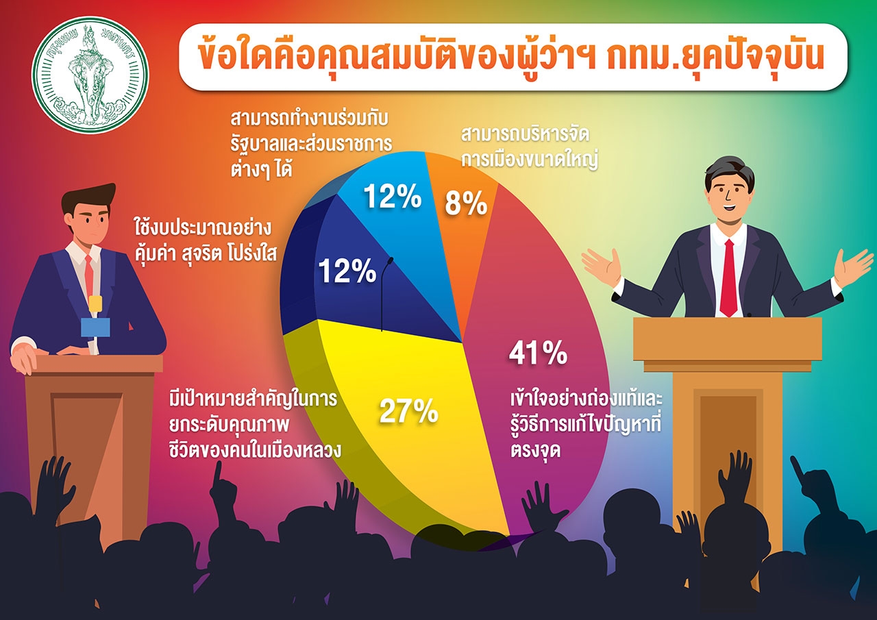 เมื่อถามถึงคุณสมบัติของผู้ที่จะมาเป็น ผู้ว่าฯ กทม.ในยุคปัจจุบันว่าควรมีลักษณะอย่างไร กลุ่มตัวอย่างมากที่สุดจำนวนร้อยละ 41 ตอบว่า ควรมีความเข้าใจปัญหาอย่างถ่องแท้และรู้วิธีการแก้ไขปัญหาอย่างตรงจุด รองลงมาจำนวนร้อยละ 27 คือเป็นผู้ที่มีเป้าหมายสำคัญในการยกระดับคุณภาพชีวิตของคนในเมืองหลวง ร้อยละ 12 เห็นว่าควรเป็นผู้ที่รู้จักใช้งบประมาณอย่างคุ้มค่า โปร่งใส พอๆ กับสามารถทำงานร่วมกับรัฐบาลและส่วนราชการต่างๆ ได้ สุดท้ายร้อยละ 8 เห็นว่า ต้องมีความสามารถในการบริหารจัดการเมืองขนาดใหญ่ตามลำดับ”