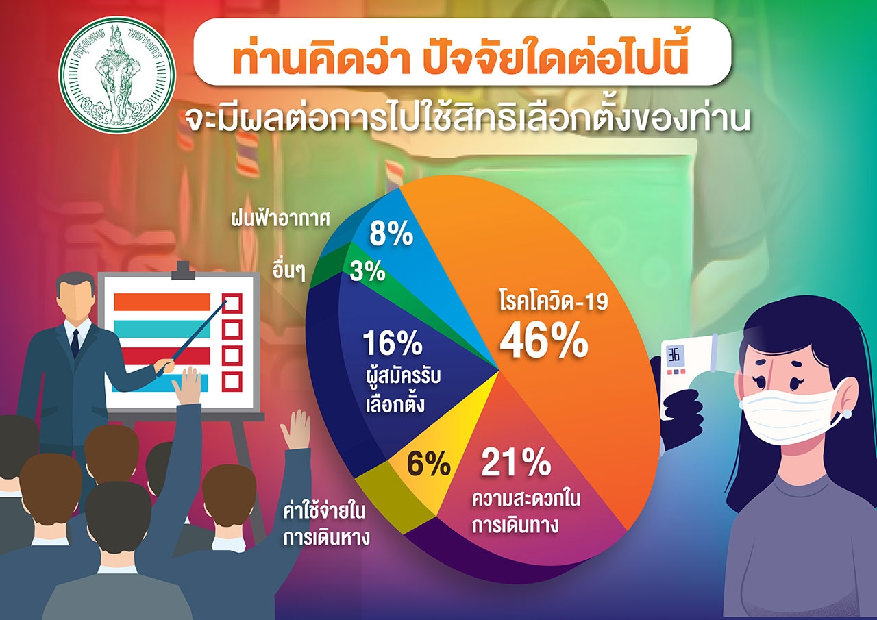 ส่วนปัจจัยที่จะมีผลต่อการไปใช้สิทธิเลือกตั้งของกลุ่มตัวอย่าง พบว่า จำนวนมากที่สุดร้อยละ 46 ยังเป็นห่วงเรื่องโรคโควิด-19 รองลงมาจำนวนร้อยละ 21 คิดถึงความสะดวกในการเดินทาง ร้อยละ 16 คิดถึงผู้สมัครรับเลือกตั้ง ร้อยละ 8 คิดว่าสภาพฝนฟ้าอากาศจะมีผล จำนวนร้อยละ 6 คิดว่าค่าใช้จ่ายในการเดินทางอาจมีผล และร้อยละ 3 คือปัจจัยอื่นๆ