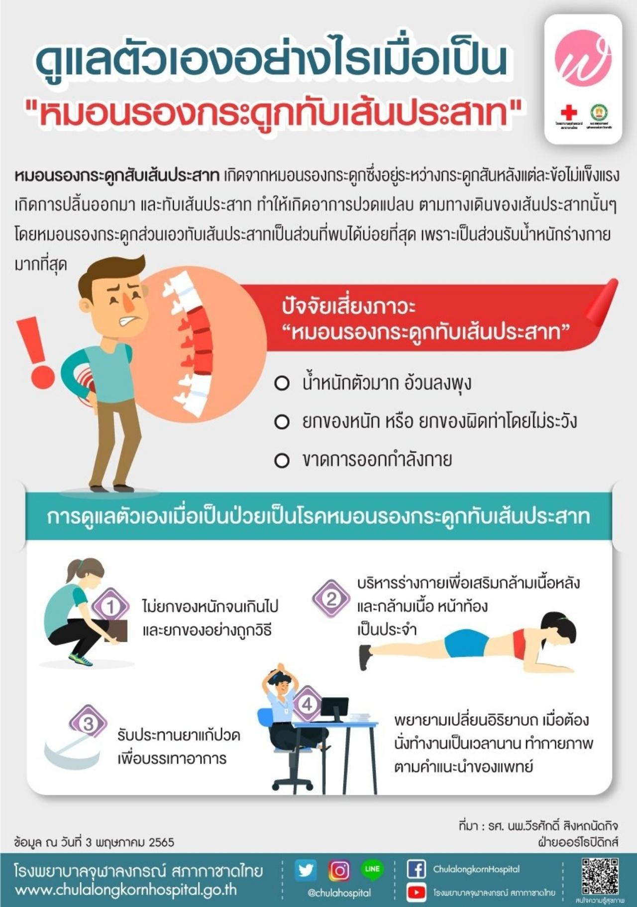เว็บไซต์ โรงพยาบาลจุฬาลงกรณ์ สภากาชาดไทย โพสต์ข้อความเรื่อง "หมอนรองกระดูกทับเส้นประสาท" โดยระบุว่า หมอนรองกระดูกทับเส้นประสาท เกิดจากหมอนรองกระดูกซึ่งอยู่ระหว่างกระดูกสันหลังแต่ละข้อไม่แข็งแรง เกิดการปลิ้นออกมา และทับเส้นประสาท ทำให้เกิดอาการปวดแปลบ ตามทางเดินของเส้นประสาทนั้นๆ โดยหมอนรองกระดูกส่วนเอวทับเส้นประสาทเป็นส่วนที่พบได้บ่อยที่สุด เพราะเป็นส่วนรับน้ำหนักร่างกายมากที่สุด