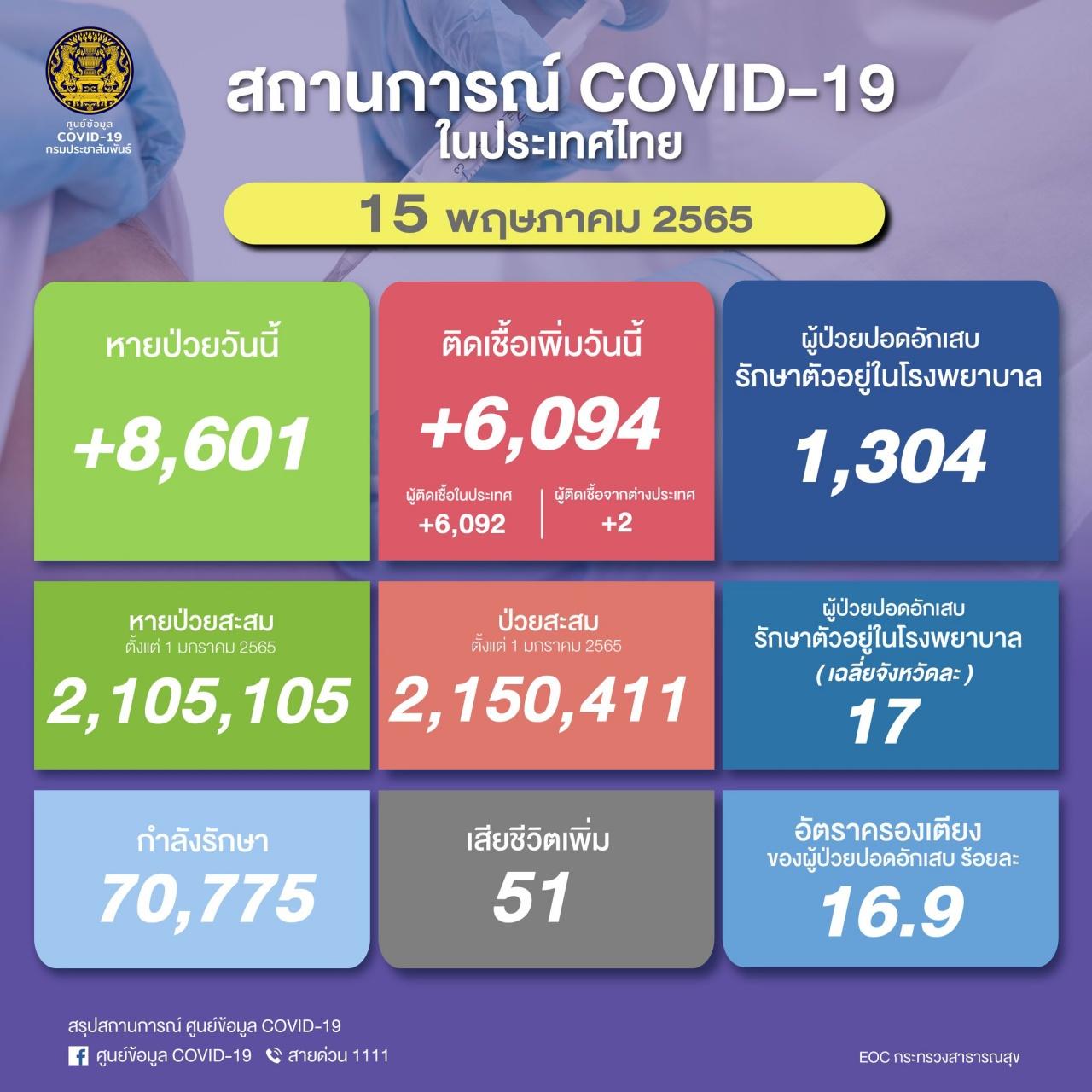 ผู้สื่อข่าวรายงานว่า กระทรวงสาธารณสุขได้รายงานสถานการณ์ "โควิด-19" ประจำวันเบื้องต้น โดยข้อมูล ณ วันที่ 15 พฤษภาคม 2565 มีผู้ป่วยติดเชื้อรายใหม่ 6,094 ราย จำแนกเป็น ผู้ติดเชื้อในประเทศ 6,092 ราย และผู้ป่วยมาจากต่างประเทศ 2 ราย ผู้ป่วยสะสม 2,150,411 ราย