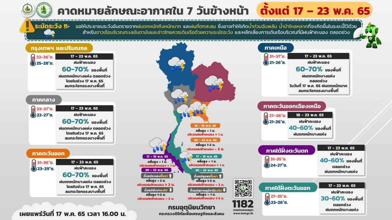 วันที่ 18 พ.ค. 65 แฟนเพจ กรมอุตุนิยมวิทยา คาดหมายลักษณะอากาศใน 7 วัน ข้างหน้า ระหว่างวันที่ 17 พฤษภาคม 2565-23 พฤษภาคม 2565