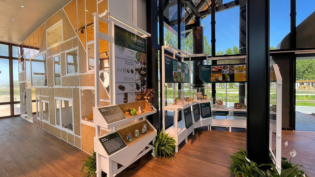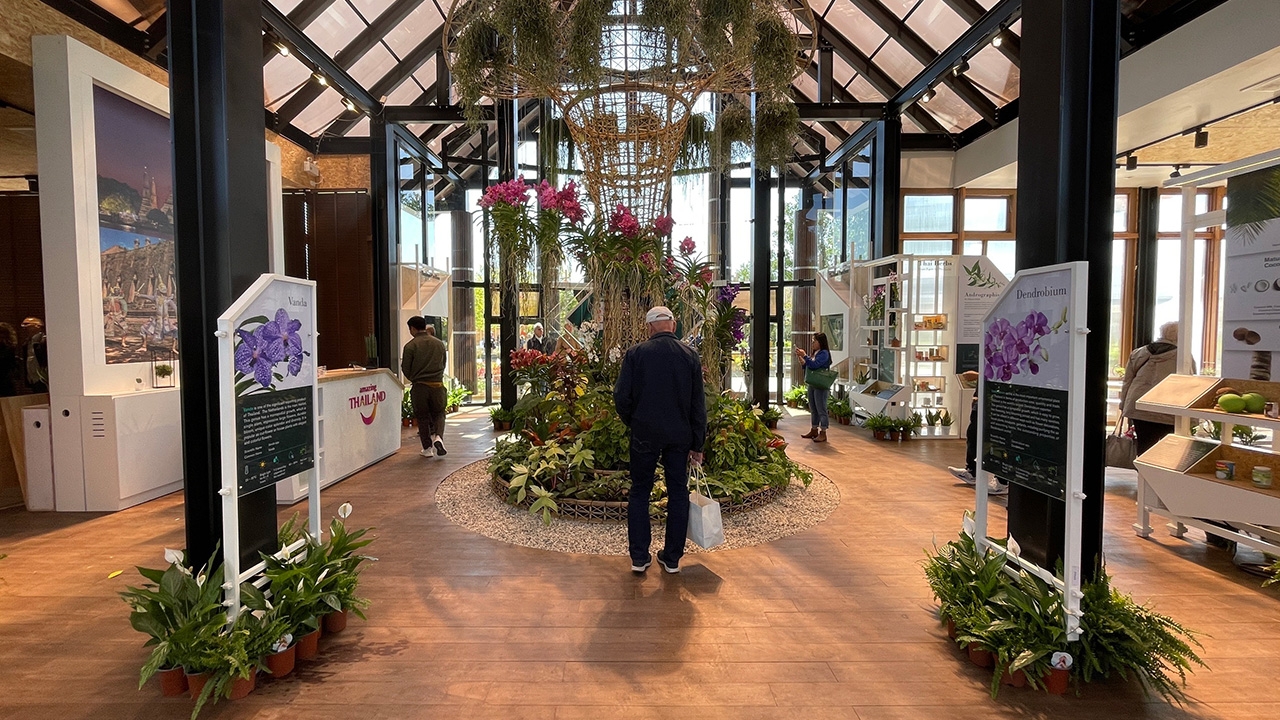 สำหรับ Thailand Pavilion หรืออาคารนิทรรศการประเทศไทย นำเสนอแนวคิด บ้านไทย บอกเล่าเรื่องราวของวิถีชีวิตคนไทยผ่านสายน้ำ พืชพรรณไม้ ผัก ผลไม้ไทย โชว์ศักยภาพนวัตกรรมด้านอาหาร สินค้าเกษตรของไทย การพัฒนากระบวนการผลิตที่ได้มาตรฐาน และคุณภาพของประเทศไทย พร้อมนำเสนอข้อมูลสำหรับต้อนรับนักท่องเที่ยวที่ชื่นชมความงดงามของธรรมชาติ วิถีชีวิต วัฒนธรรม ขนบธรรมเนียมประเพณีไทย ผ่านนิทรรศการโซนต่างๆ ได้แก่ 1) โซน Welcome to Thailand นำเสนอเรื่องราวเกี่ยวกับประเทศไทย เริ่มตั้งแต่ความสัมพันธ์ทางการทูตระหว่างประเทศไทยและเนเธอร์แลนด์ ตัวอย่างโครงการตามแนวคิด BCG Model การท่องเที่ยวไทยและท่องเที่ยวเชิงเกษตร 2) โซน Future Products จัดแสดงสินค้าที่มีศักยภาพในการส่งออกทั้งที่เป็นอาหาร และไม่ใช่อาหาร 3) โซน Showroom นำเสนอตัวอย่างสินค้าที่มีศักยภาพในการส่งออก เช่น สินค้าเกษตรและผลิตภัณฑ์ (ด้านอาหาร และไม่ใช่อาหาร สินค้าในอนาคต และสินค้าที่มีศักยภาพ) ผลิตภัณฑ์สมุนไพร สปา และเวชสำอาง ผลิตภัณฑ์วัฒนธรรมไทย Cultural Product of Thailand: CPOT ผลิตภัณฑ์จากผ้าไหมและผ้าฝ้าย ผลิตภัณฑ์จากยางพารา ผลิตภัณฑ์เครื่องประดับจากกล้วยไม้ ดอกไม้อบแห้ง เป็นต้น และ 4) โซนนิทรรศการหมุนเวียน นำเสนอสินค้าพืชสวนไทยผ่านการจัดกิจกรรมหมุนเวียน ที่มีทั้งการสาธิต และการชิมสินค้าเกษตรต่างๆ จำนวน 6 ครั้ง ได้แก่ ครั้งที่ 1 “Glamorous...Thai Orchids and Air Purifying plants (Sansevieria)” เสน่ห์...กล้วยไม้และไม้ฟอกอากาศ (สกุลลิ้นมังกร) ครั้งที่ 2 “Everlasting Fruit Season 1” นิทรรศการผลไม้อัตลักษณ์ภาคตะวันออก ครั้งที่ 3 “Thai Herbs for Relaxing Life” นิทรรศการสมุนไพร ครั้งที่ 4 “New selection for good health” นิทรรศการผัก ครั้งที่ 5 “Everlasting Fruit Season 2” นิทรรศการผลไม้อัตลักษณ์ภาคใต้ และครั้งที่ 6 “Worth of the graceful leafy Thai Ornamental Plant” นานาพรรณคุณค่าไม้ประดับไทย