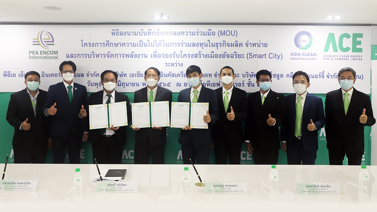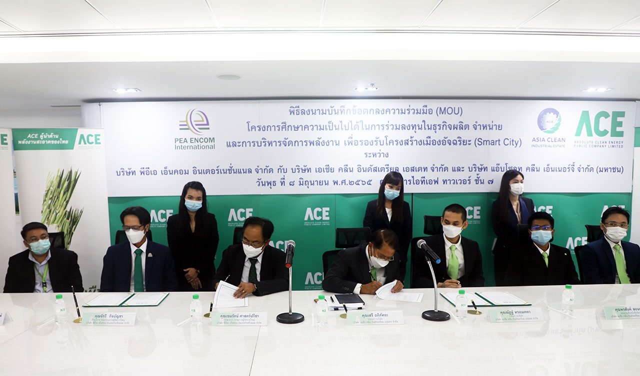 นายเขมรัตน์ ศาสตร์ปรีชา รองผู้ว่าการการไฟฟ้าส่วนภูมิภาค รักษาการกรรมการผู้จัดการใหญ่ บริษัท พีอีเอ เอ็นคอม อินเตอร์เนชั่นแนล จำกัด (PEA ENCOM) ร่วมลงนามบันทึกข้อตกลงความร่วมมือ (MOU) โครงการศึกษาความเป็นไปได้ในการร่วมลงทุนในธุรกิจผลิตและจำหน่ายไฟฟ้า ธุรกิจระบบส่งและจำหน่ายไฟฟ้าอัจฉริยะ รองรับการขับเคลื่อนนิคมอุตสาหกรรมเอเชีย คลีน สู่ Smart City กับ บริษัท แอ๊บโซลูท คลีน เอ็นเนอร์จี้ จำกัด (มหาชน) (ACE) และ บริษัท เอเชีย คลีน อินดัสเตรียล เอสเตท จำกัด (ACIE) ณ ห้องประชุมกลาง ชั้น 7 อาคาร ITF TOWER