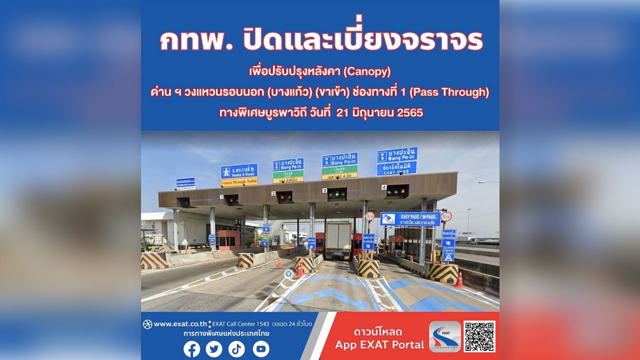 การทางพิเศษแห่งประเทศไทย (กทพ.) กระทรวง โดยบริษัท ไทย ฟอร์จูน เอส เทรดดิ้ง จำกัด ผู้รับจ้าง งานปรับปรุงหลังคา Canopy ด่านเก็บค่าผ่านทาง ทางพิเศษบูรพาวิถี (ด่านฯ บางนา กม.6 ขาเข้า, ด่านฯ บางนา กม.6 ขาออก และด่านฯ วงแหวนรอบนอก (บางแก้ว)) จะเข้าดำเนินการติดตั้งแผ่นฝ้า Spander และงานติดตั้ง Flashing พร้อมช่อง Service จึงมีความจำเป็นต้องเบี่ยงการจราจรบริเวณด่านเก็บค่าผ่านทางพิเศษวงแหวนรอบนอก (บางแก้ว) (ขาเข้า) ทางพิเศษบูรพาวิถี โดยจะเบี่ยงการจราจรจากช่องทางที่ 1 (Pass Through) ไปช่องทางที่ 2 ตั้งแต่วันที่ 21 มิถุนายน ช่วงเวลา 01.00-24.00 น.