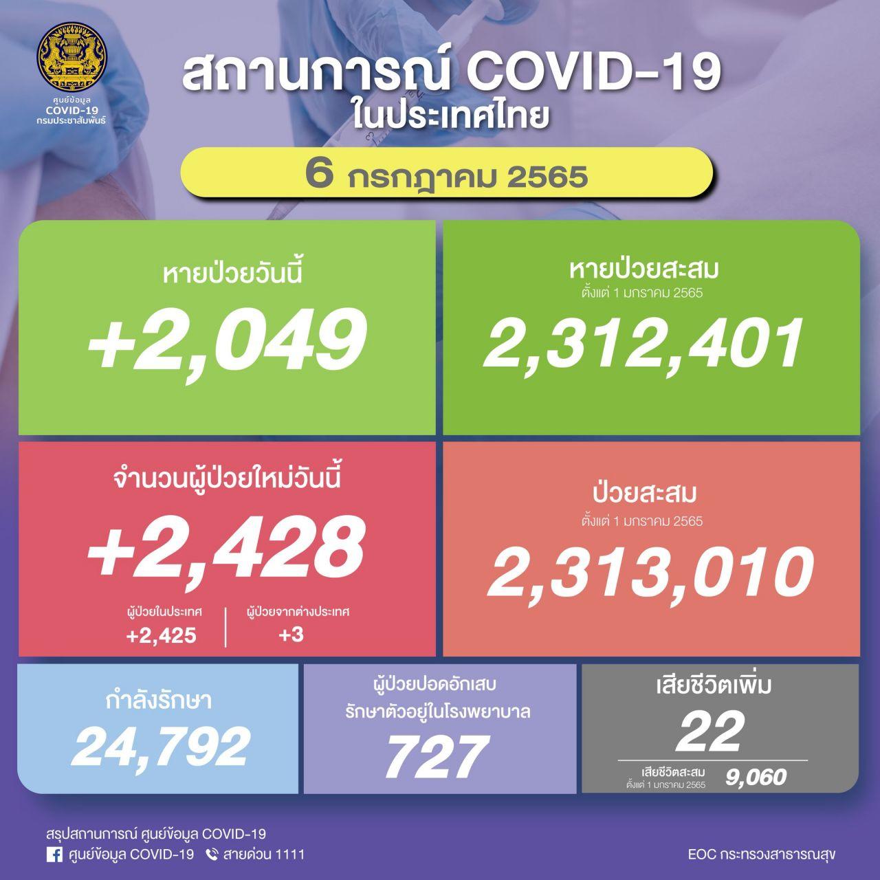 ผู้สื่อข่าวรายงานว่า กระทรวงสาธารณสุขได้รายงานสถานการณ์ "โควิด-19" ประจำวันเบื้องต้น โดยข้อมูล ณ วันที่ 6 กรกฎาคม 2565 มีผู้ป่วยติดเชื้อรายใหม่ 2,428 ราย จำแนกเป็น ผู้ติดเชื้อในประเทศ 2,425 ราย และผู้ป่วยมาจากต่างประเทศ 3 ราย ผู้ป่วยสะสม 2,313,010 ราย