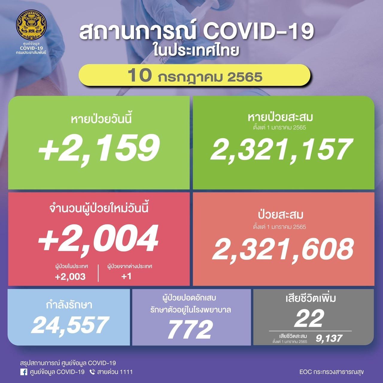 ผู้สื่อข่าวรายงานว่า กระทรวงสาธารณสุขได้รายงานสถานการณ์ "โควิด-19" ประจำวันเบื้องต้น โดยข้อมูล ณ วันที่ 10 กรกฎาคม 2565 มีผู้ป่วยติดเชื้อรายใหม่ 2,159 ราย จำแนกเป็น ผู้ติดเชื้อในประเทศ 2,003 ราย และผู้ป่วยมาจากต่างประเทศ 1 ราย ผู้ป่วยสะสม 2,321,157 ราย