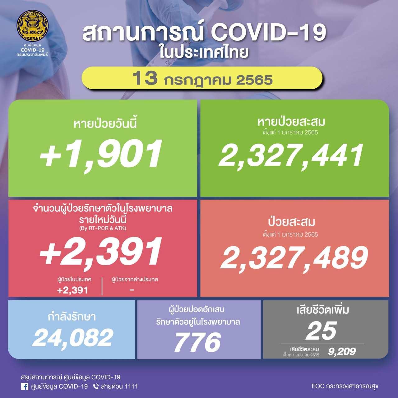 ผู้สื่อข่าวรายงานว่า กระทรวงสาธารณสุขได้รายงานสถานการณ์ "โควิด-19" ประจำวันเบื้องต้น โดยข้อมูล ณ วันที่ 13 กรกฎาคม 2565 มีผู้ป่วยรายใหม่ (รักษาตัวใน รพ.) 2,391 ราย จำแนกเป็น ผู้ติดเชื้อในประเทศ 2,391 ราย และผู้ป่วยมาจากต่างประเทศ - ราย ผู้ป่วยสะสม 2,327,489 ราย
