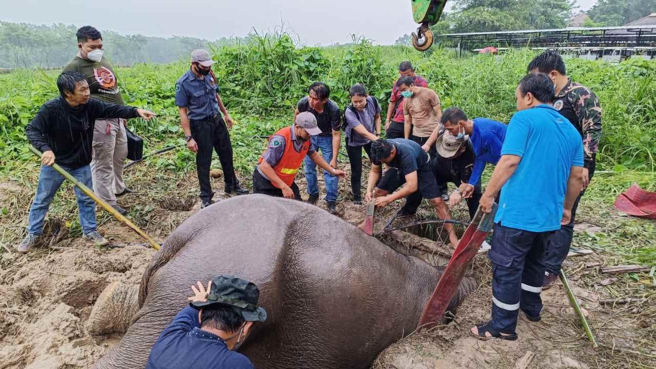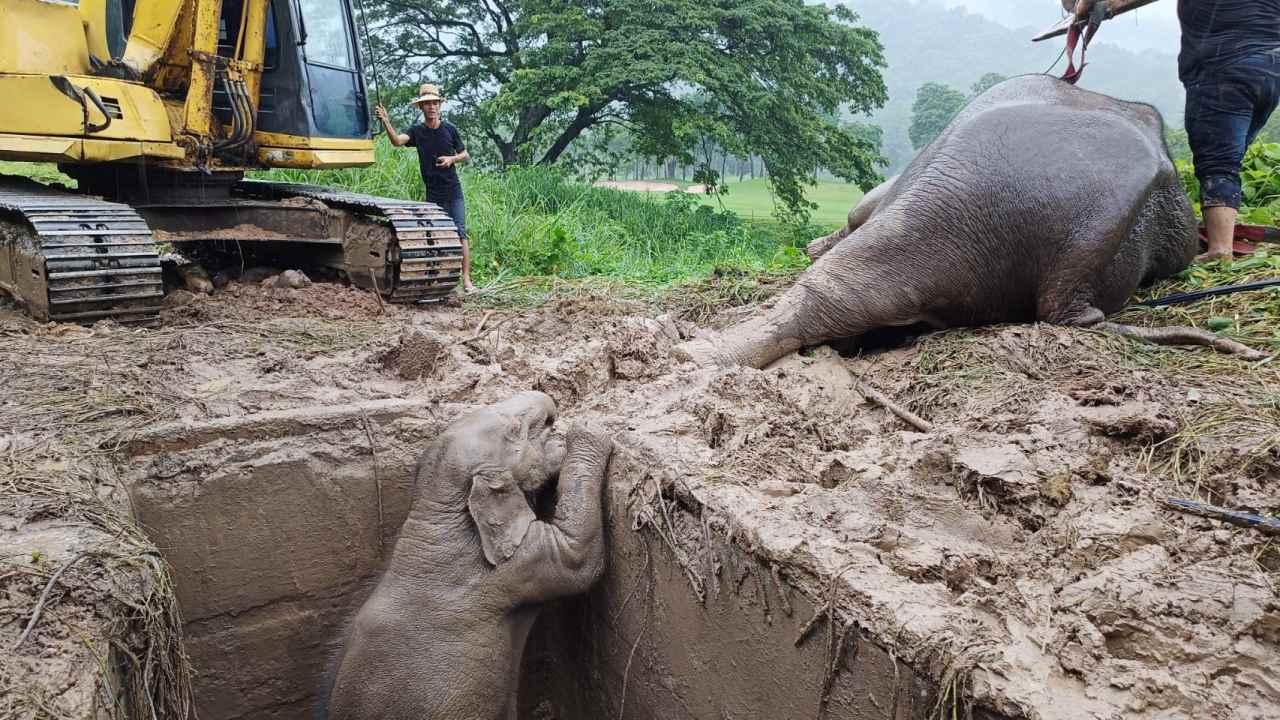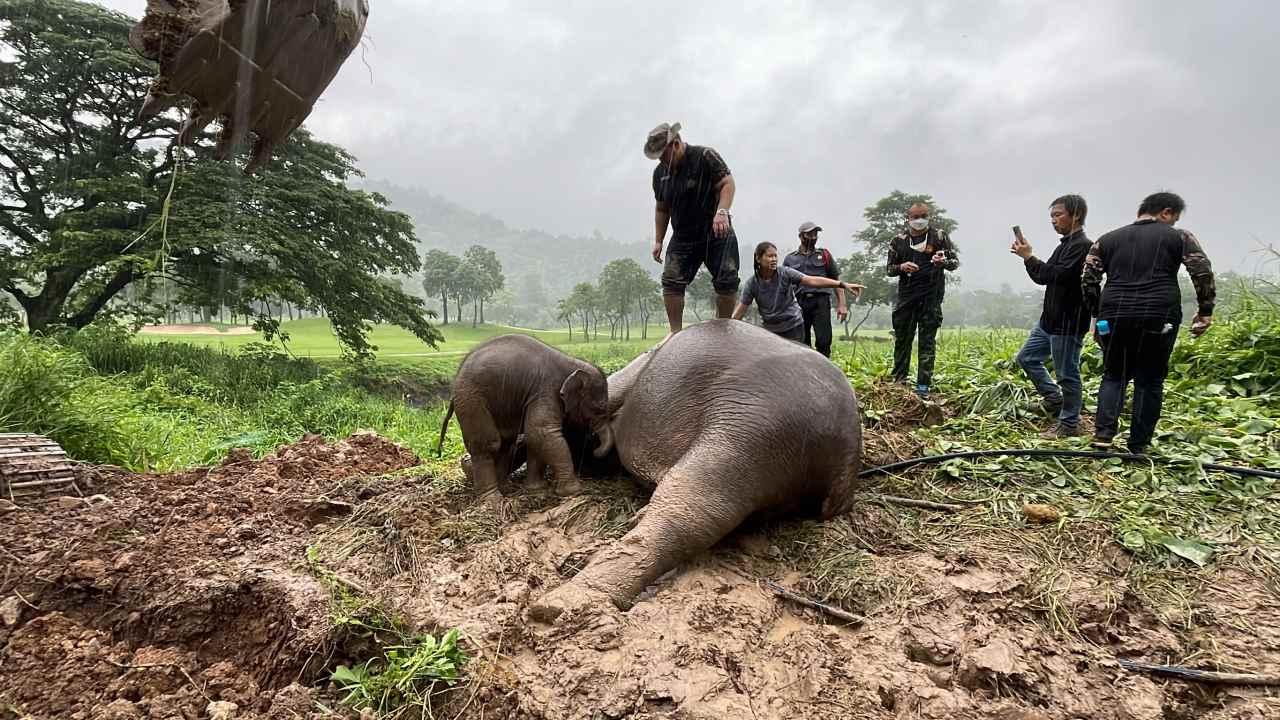 หลังจากแม่ช้างถูกยิงยาซึมแล้วเกิดพลัดตกลงไปในบ่อที่มีลูกช้างอยู่นั้น ลุงหมู บอกว่า เหตุการณ์แบบนี้ในหน้างานอาจจะเกิดเหตุการณ์ที่คาดไม่ถึงได้ ซึ่งหน้างานในตอนนั้นมีฝนตกทำให้ดินโดยรอบชุ่มน้ำแล้วเกิดทรุดตัวลง ประกอบกับแม่ช้างได้รับยาและยืนอยู่กับที่ ทำให้น้ำหนักตัวช้างกดลงที่ผิวดินจนดินเกิดสไลด์ แม่ช้างยืนอยู่ใกล้ขอบบ่อมากและกำลังคลานเข้าไปหาลูกจึงทำให้ลื่นลงไปที่บ่อบริเวณช่วงท้องหน้าอก ทำให้ลูกช้างได้ดูดนมแม่ช้างในตอนนั้นได้ จากนั้นได้ช่วยนำแม่ช้างขึ้นมาจากบ่อ และใช้รถแบ็กโฮเปิดปากบ่อให้ลูกช้างสามารถเดินขึ้นมายังด้านบนได้
