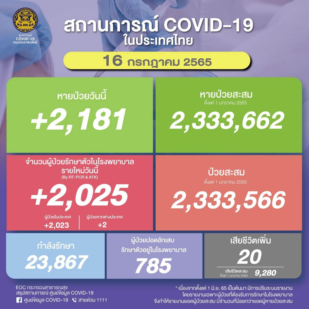 ผู้สื่อข่าวรายงานว่า กระทรวงสาธารณสุขได้รายงานสถานการณ์ "โควิด-19" ประจำวันเบื้องต้น โดยข้อมูล ณ วันที่ 16 กรกฎาคม 2565 มีผู้ป่วยรายใหม่ (รักษาตัวใน รพ.) จำนวน 2,025 ราย จำแนกเป็น ผู้ติดเชื้อในประเทศ 2,023 ราย และผู้ป่วยมาจากต่างประเทศ 2 ราย ผู้ป่วยสะสม 2,333,566 ราย
