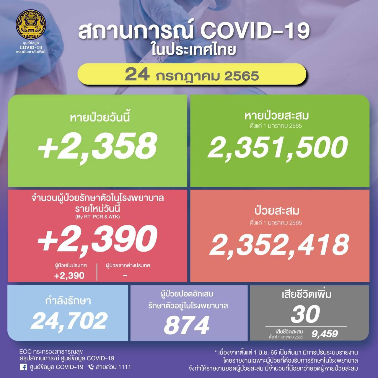 อัปเดตสถานการณ์ "โควิด-19" วันนี้มีผู้ป่วยรายใหม่ รักษาตัวใน รพ. 2,390 ราย ทำให้มีผู้ป่วยสะสม 2,352,418 ราย หายป่วยกลับบ้าน 2,358 ราย เสียชีวิต 30 ศพ