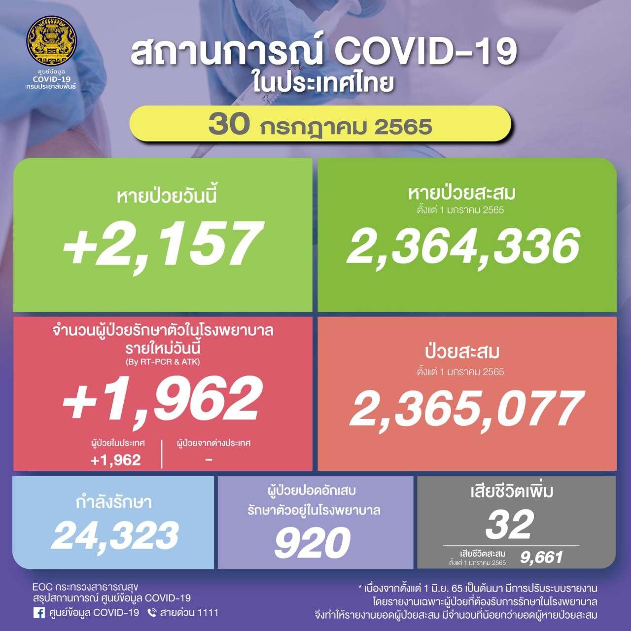 อัปเดตสถานการณ์ "โควิด-19" วันนี้มีผู้ป่วยรายใหม่ รักษาตัวใน รพ. 1,962 ราย ทำให้มีผู้ป่วยสะสม 2,365,077 ราย หายป่วยกลับบ้าน 2,157 ราย เสียชีวิต 32 ศพ