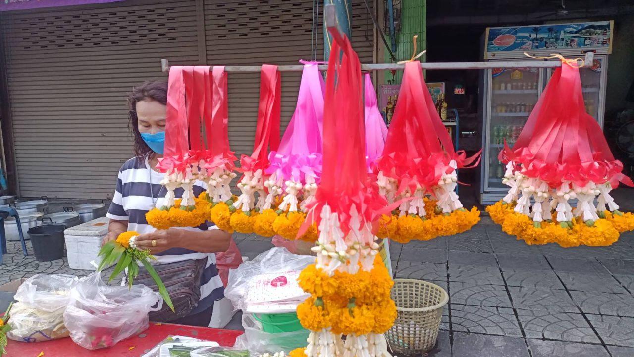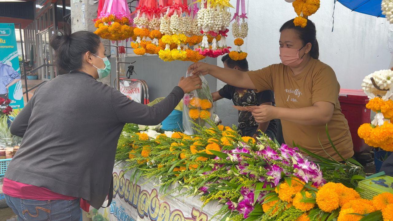 แม่ค้าขายพวงมาลัยและดอกไม้ ตลาดสดริมแม่น้ำสะแกกรัง กล่าวต่อว่า ส่วนพวงมาลัยที่ใช้ไหว้พระนั้น ขายในราคาปกติเนื่องจากเกรงใจลูกค้าขาประจำที่มาซื้อไปไหว้พระทำบุญในตอนเช้า มีตั้งแต่ราคาพวงละ 10 บาท จนถึง 20 บาท แต่ก็จะขอปรับปริมาณของดอกไม้ในพวงมาลัยลงบ้างเนื่องจากต้นทุนสูงนั่นเอง สำหรับดอกไม้ที่ใช้ถวายพระสงฆ์ที่เป็นช่อดอกดาวเรืองกับใบเตยก็ต้องขอปรับปริมาณดอกดาวเรืองลงจากเคยใส่ช่อละ 3 ดอกก็เหลือ 2 ดอก ก็เพราะว่าดอกดาวเรืองนั้นขึ้นราคามาเป็นดอกละ 2 บาท ซึ่งจากเดิมนั้นเคยขายเป็นร้อยละ 80 บาท